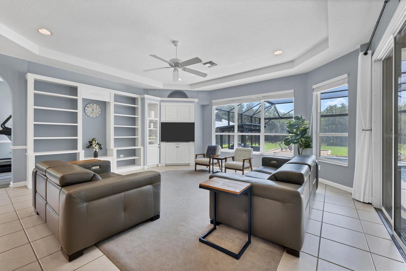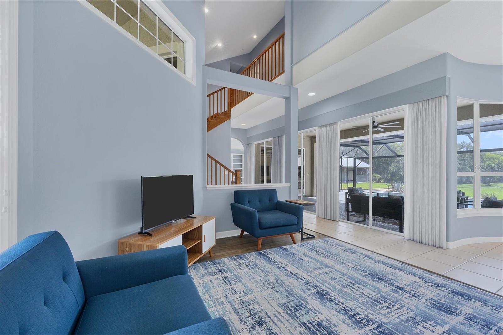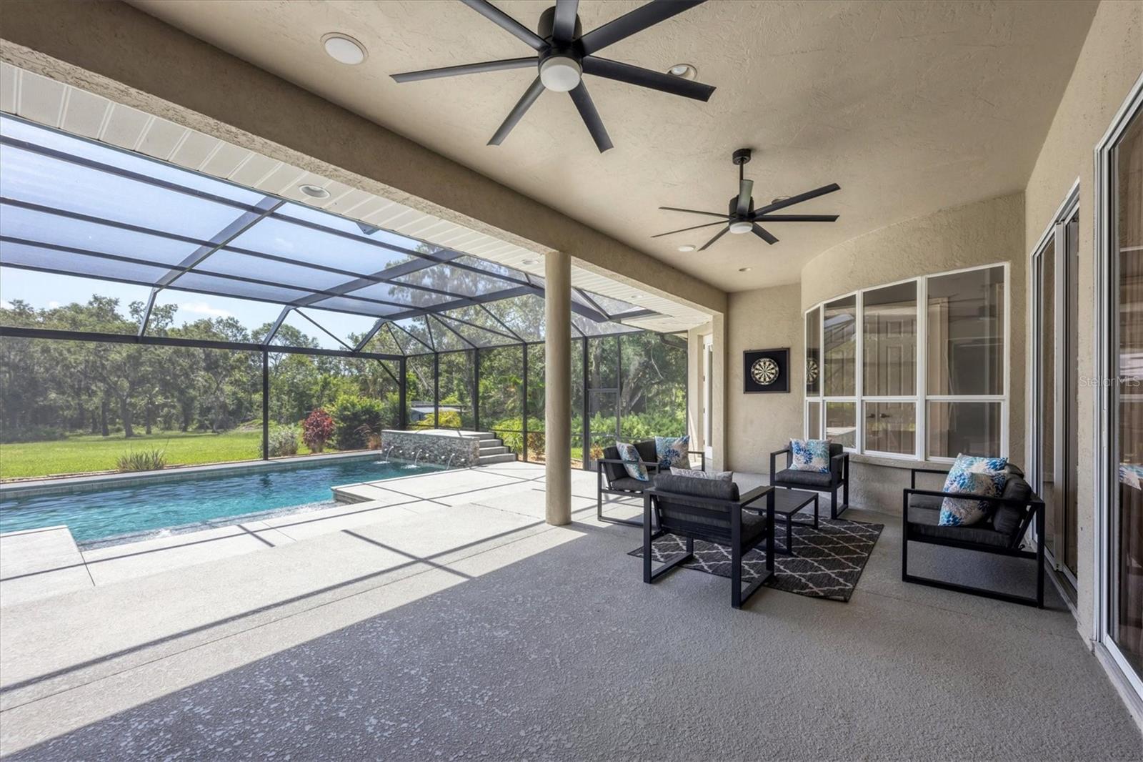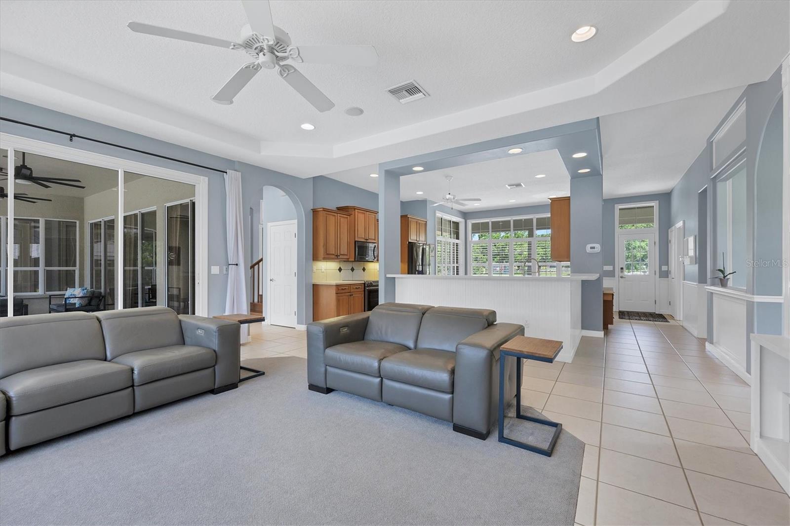 views of the front yard and backyard pool. Step outside to the expansive covered patio, where