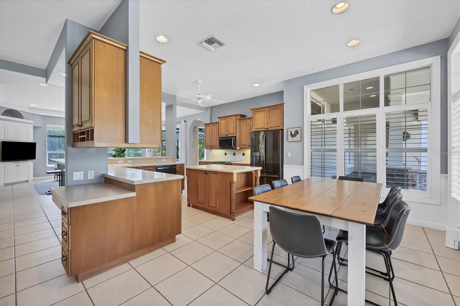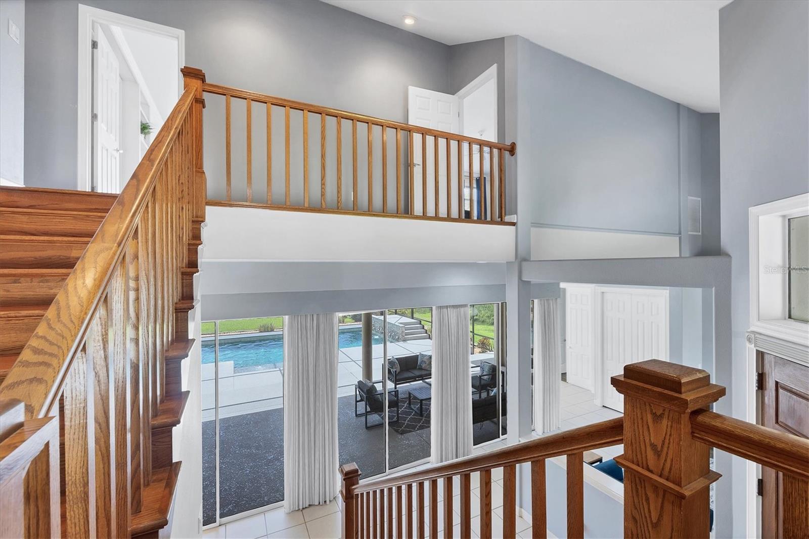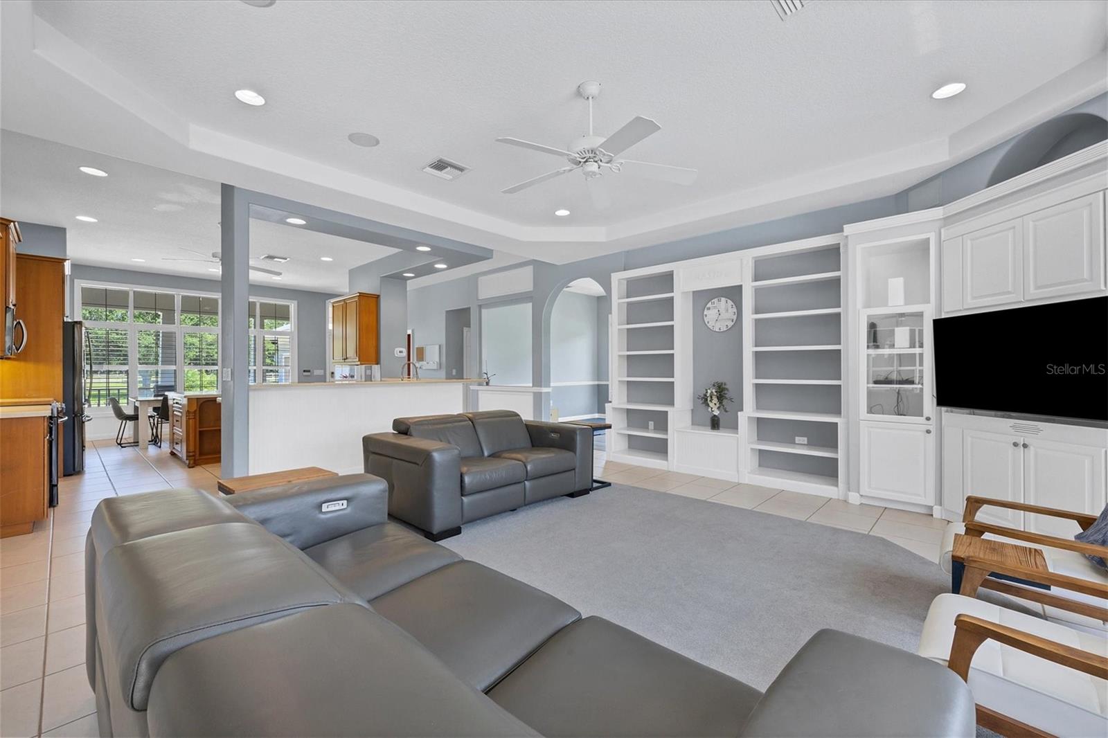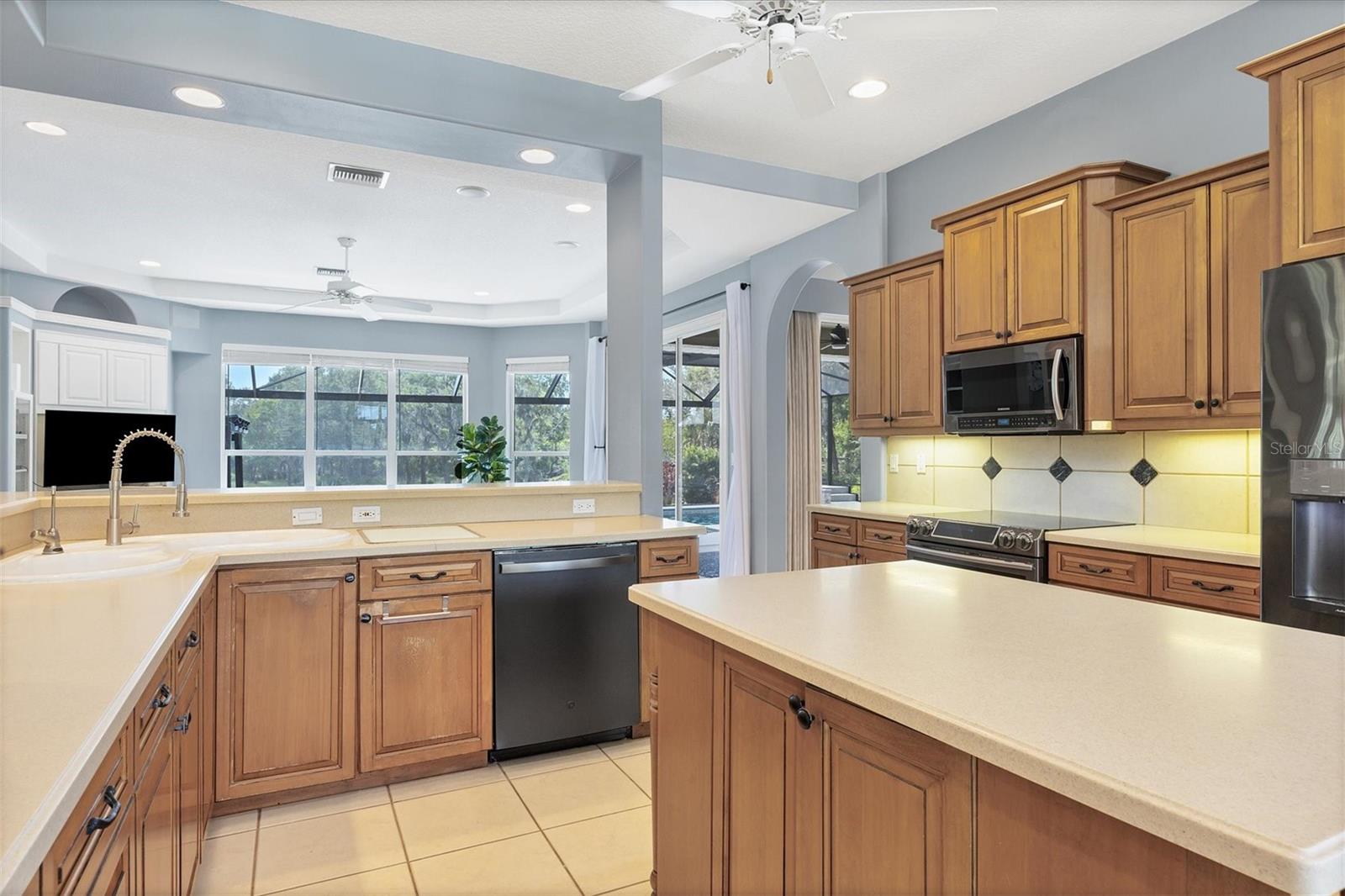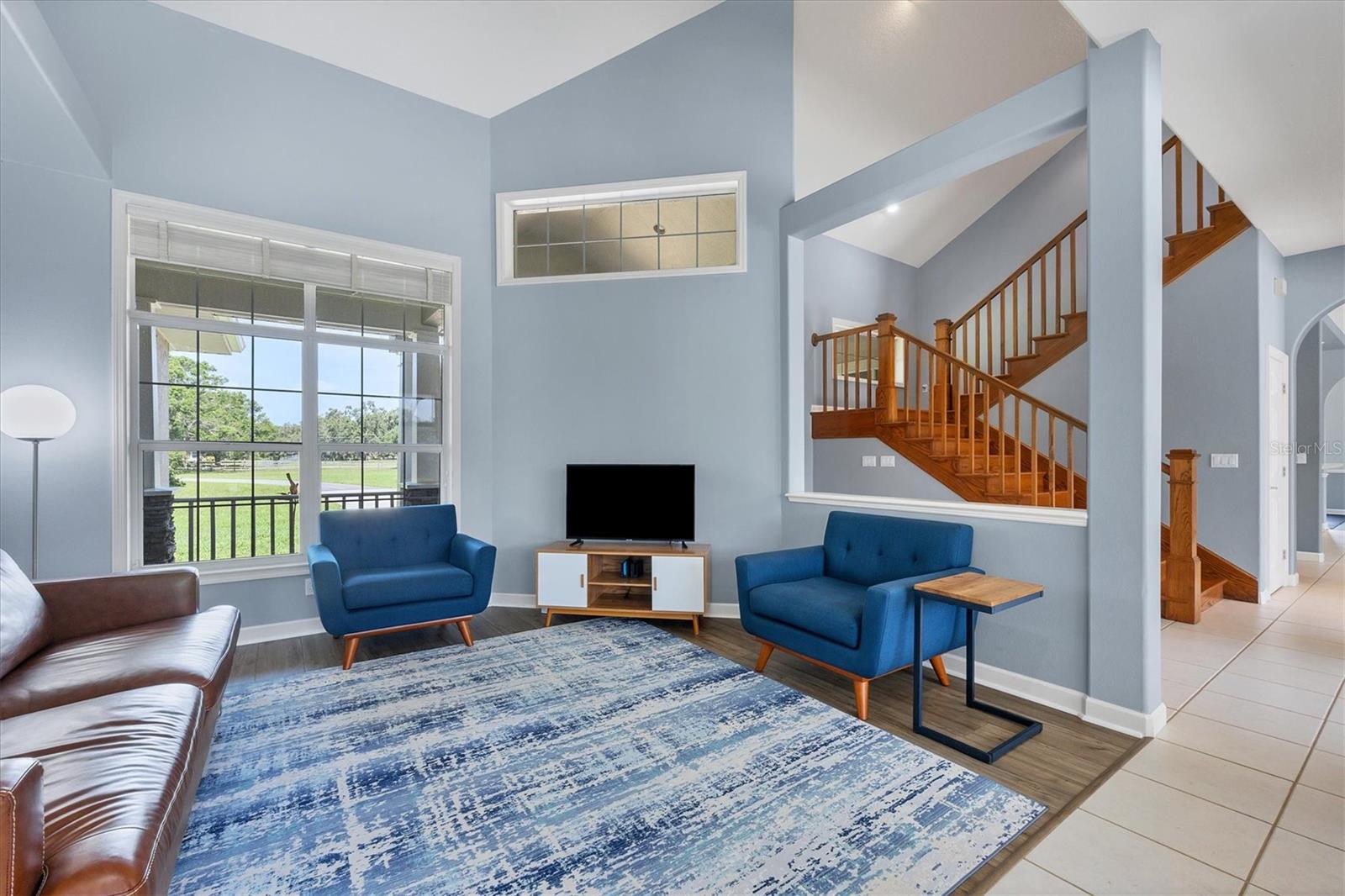 views of the front yard and backyard pool. Step outside to the expansive covered patio, where
