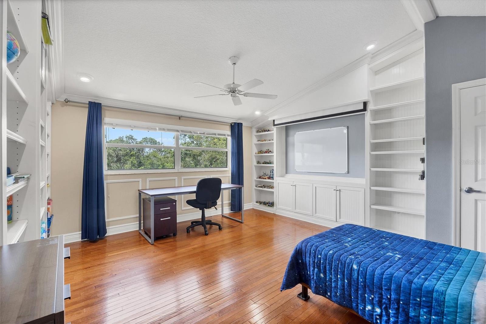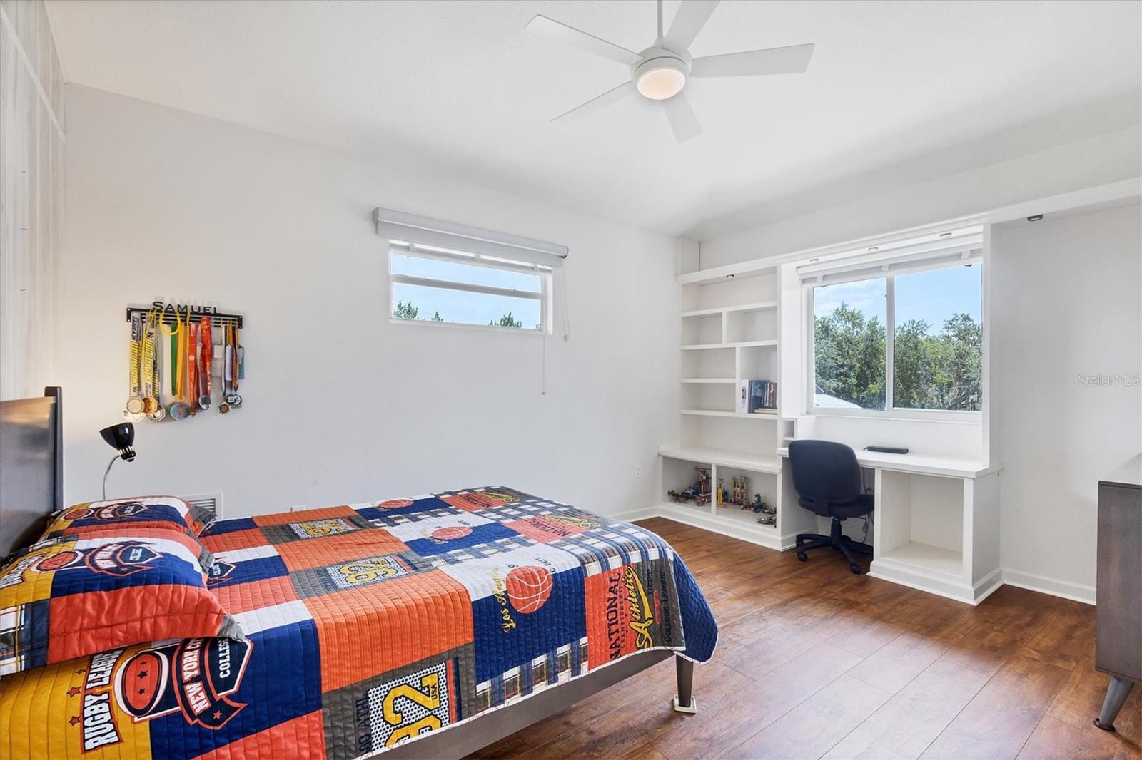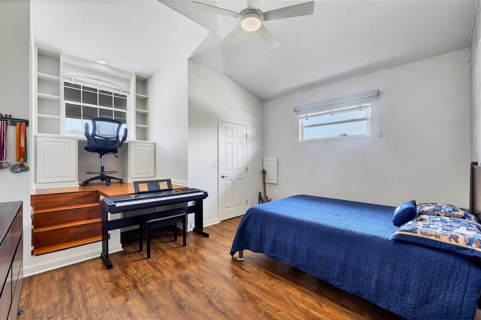 like a window seat, built-in shelving, and an elevated desk space. The flex room can be used as a
