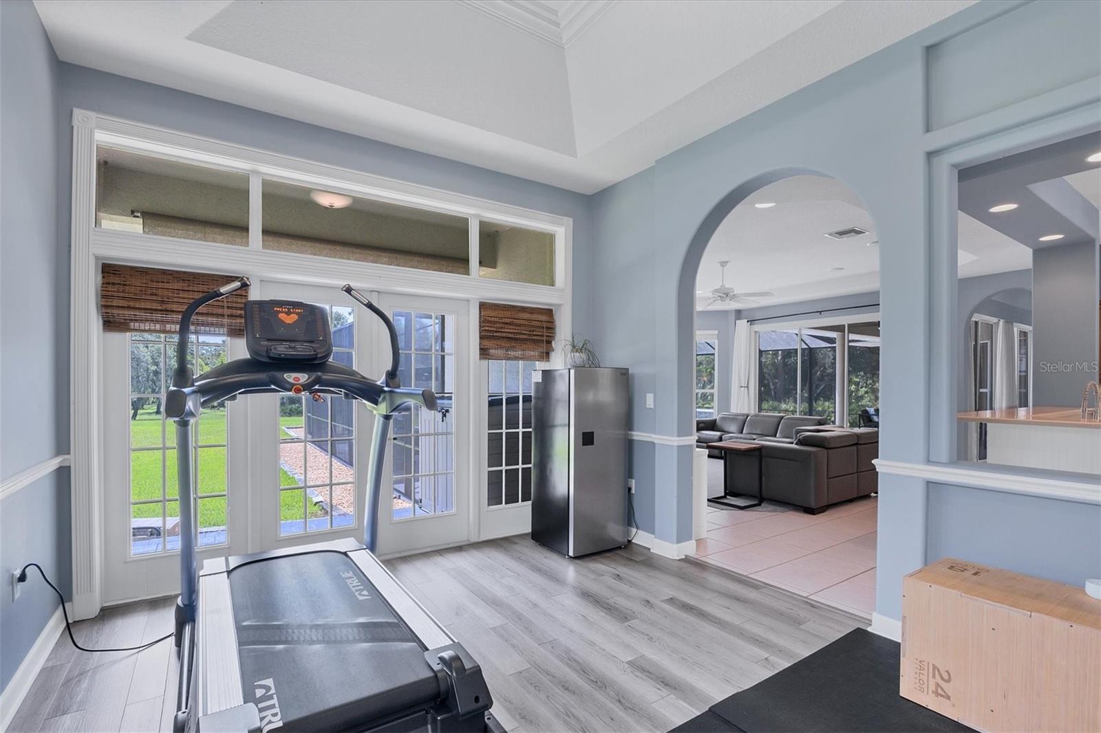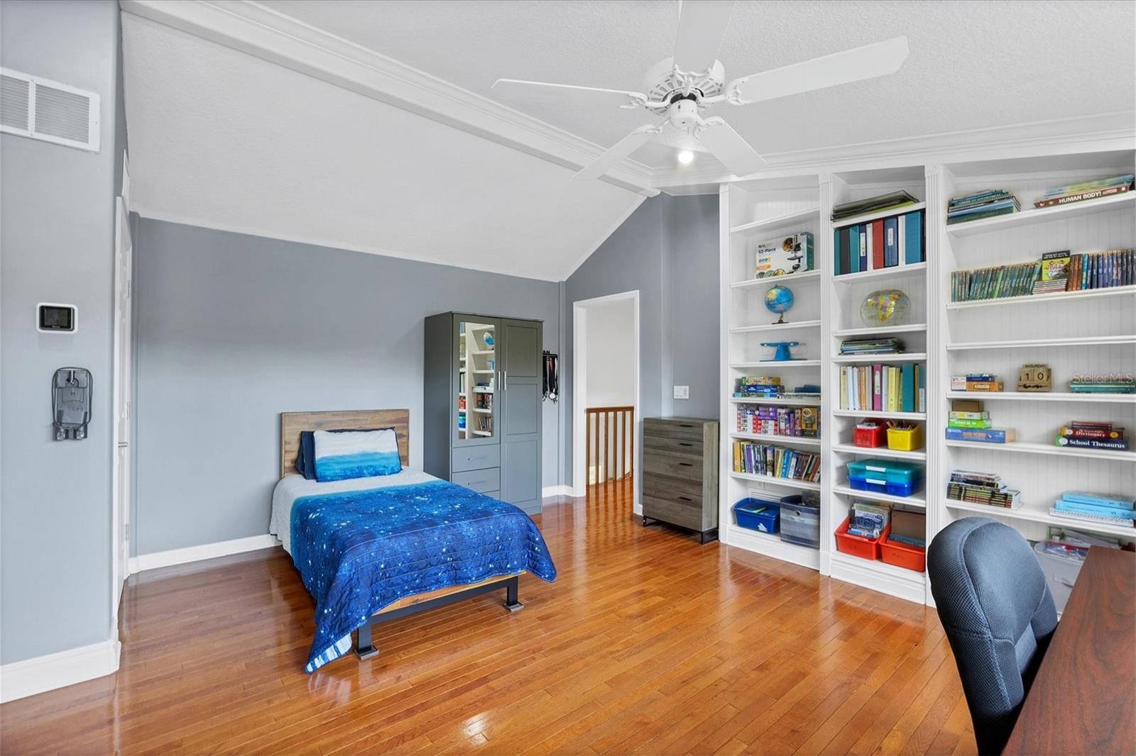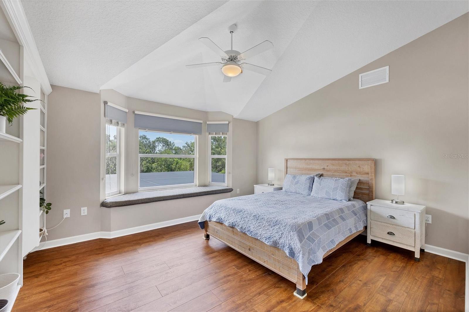 like a window seat, built-in shelving, and an elevated desk space. The flex room can be used as a
