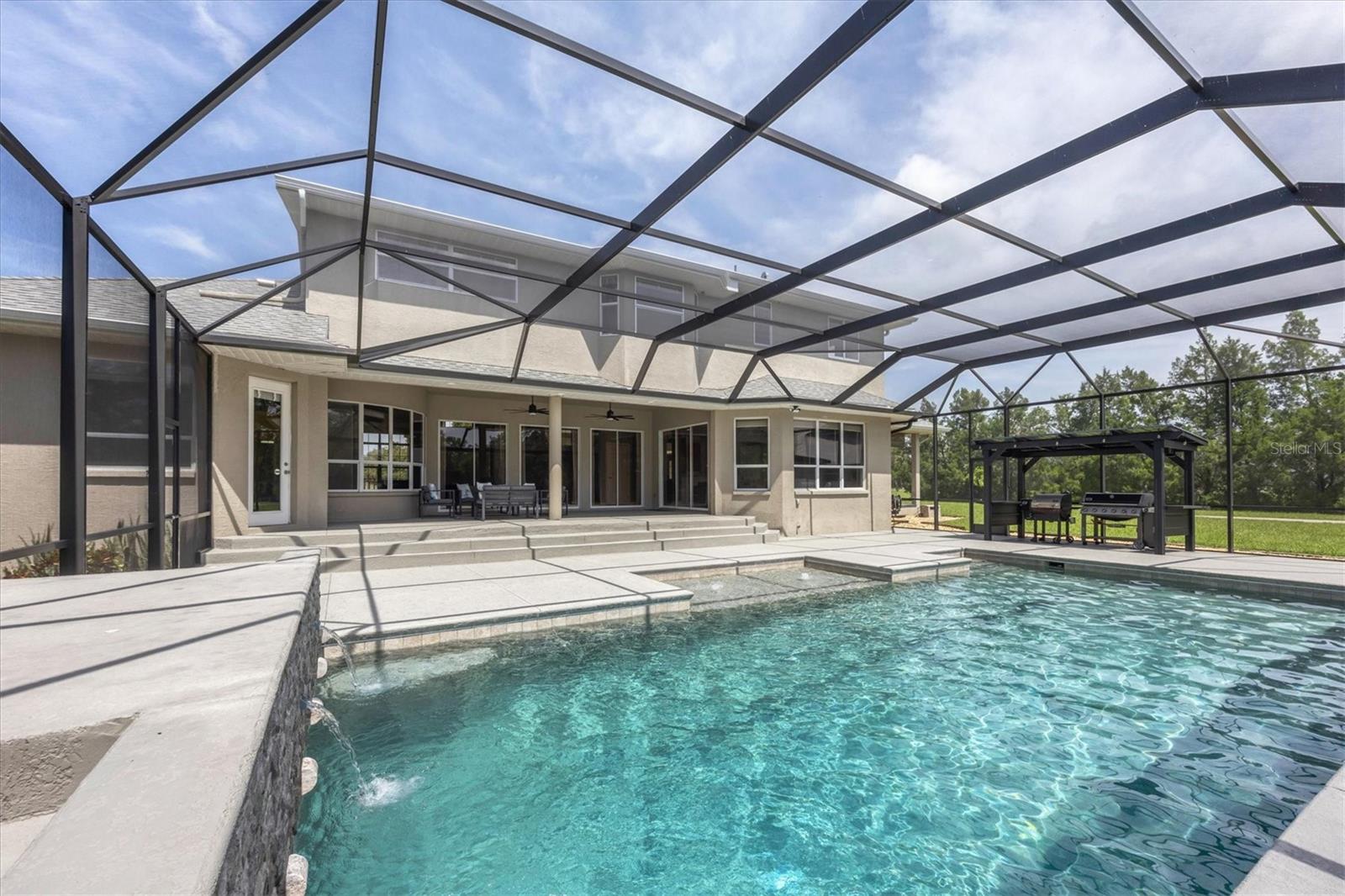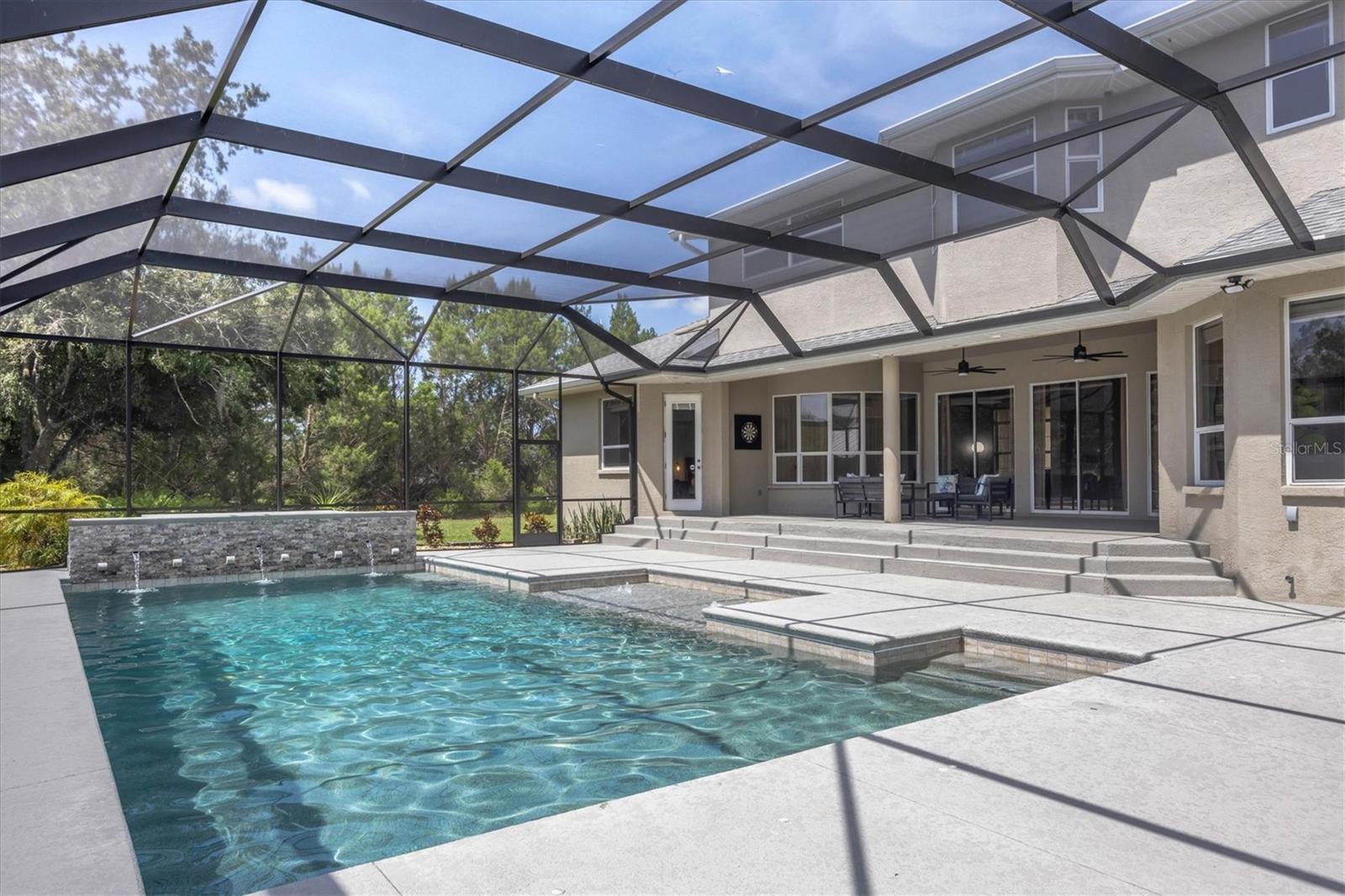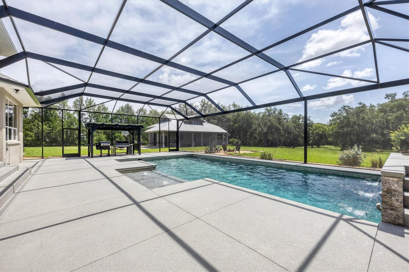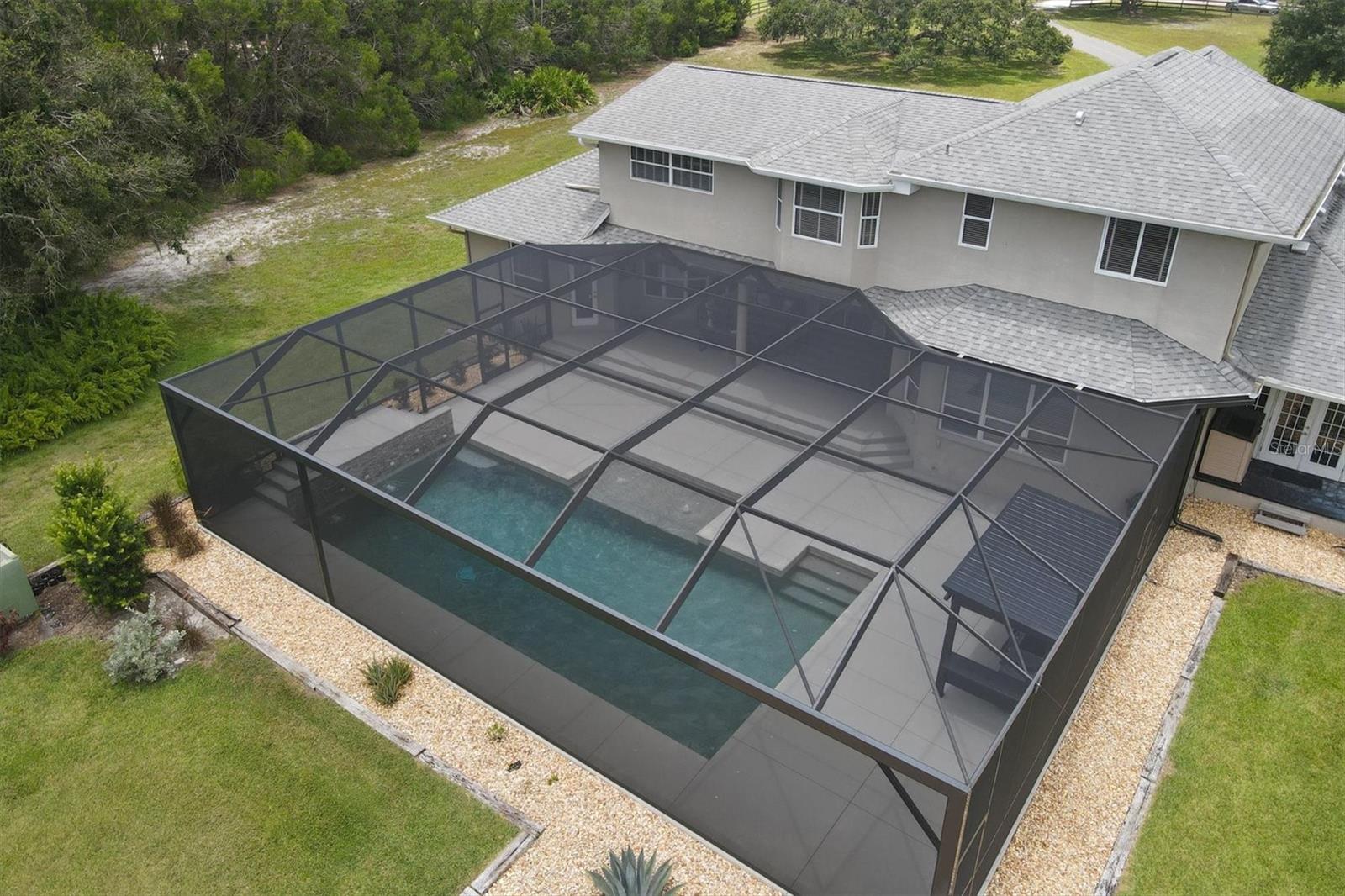 you'll find a self-cleaning saltwater pool with fountain (2021) and panoramic screened enclosure