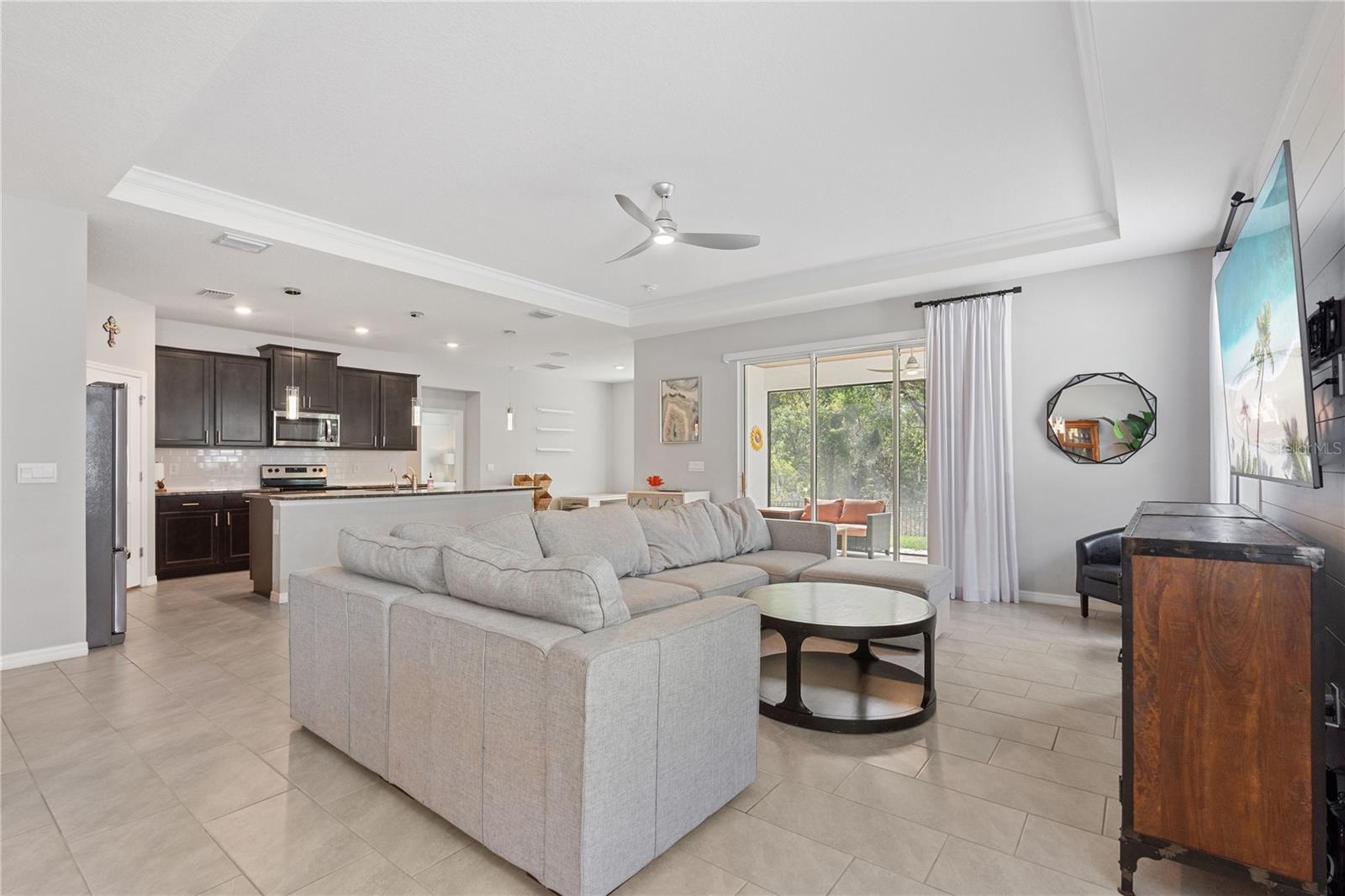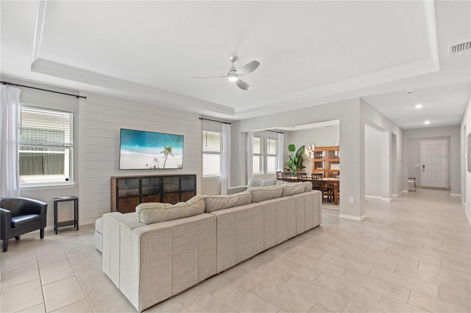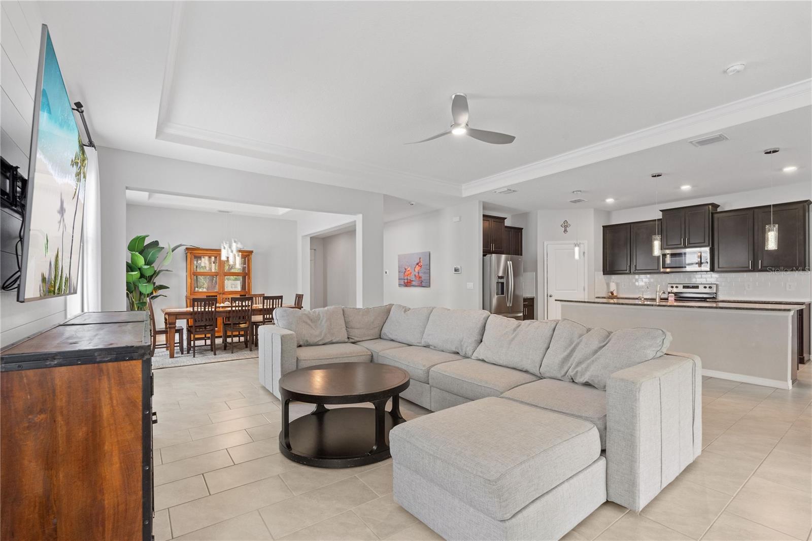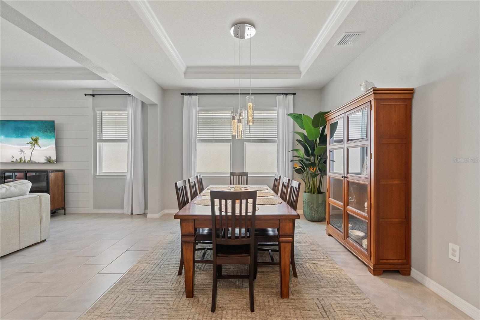 As you step inside, you're welcomed by an open and airy layout enhanced with crown molding, tray ceilings, and elegant shiplap accents, creating a refined yet inviting ambiance. The spacious living area flows seamlessly into the dining and kitchen spaces, perfect for relaxing or entertaining.