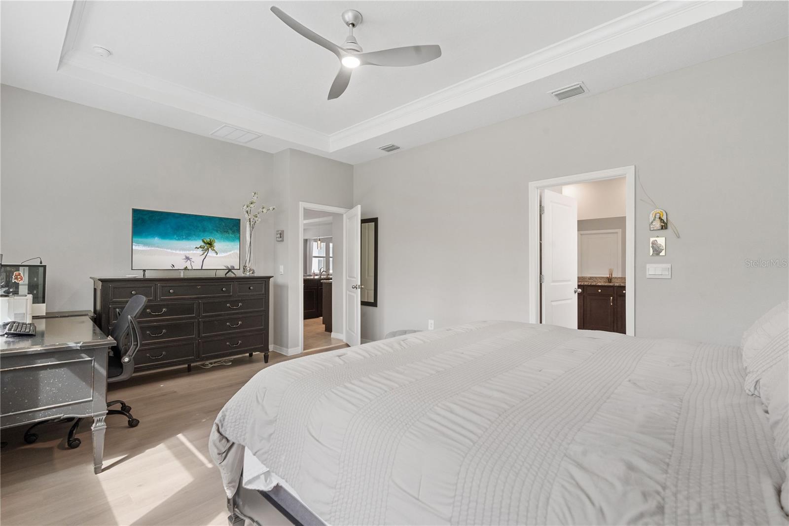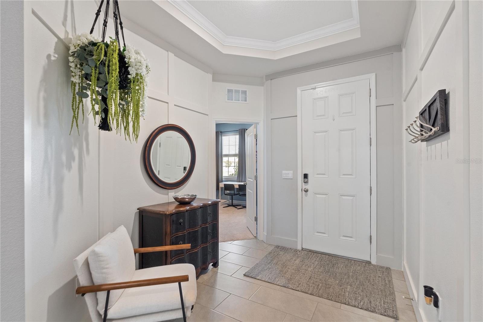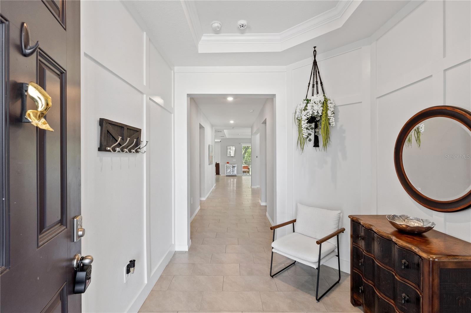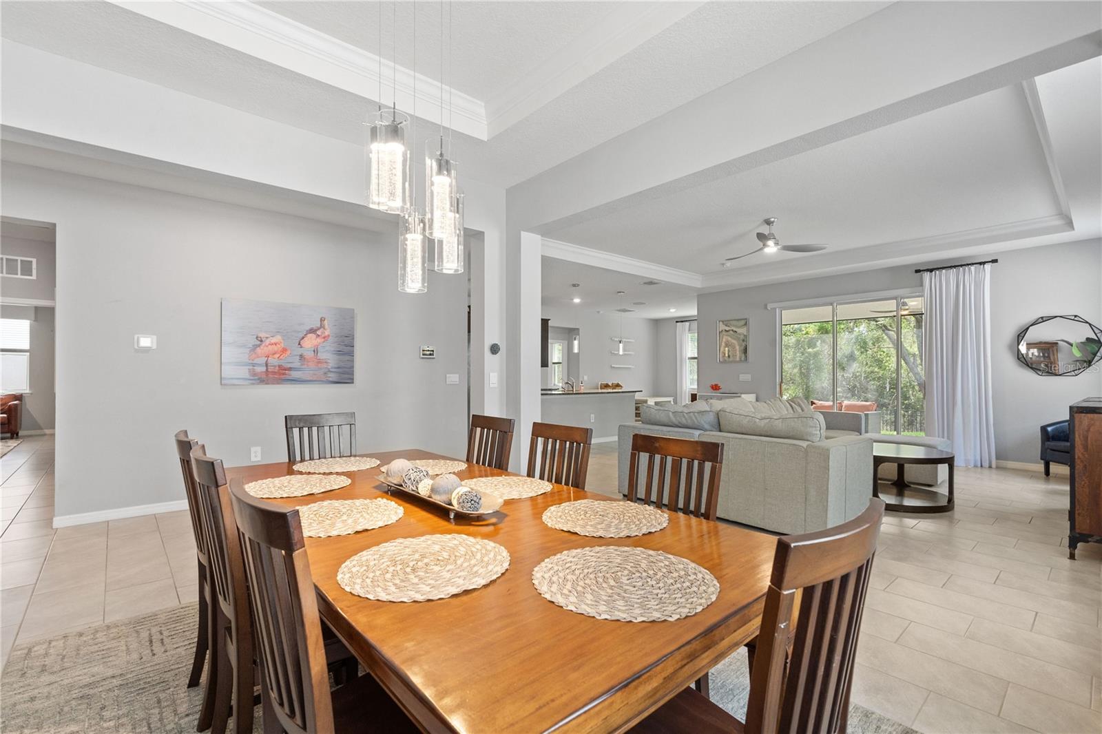 As you step inside, you're welcomed by an open and airy layout enhanced with crown molding, tray ceilings, and elegant shiplap accents, creating a refined yet inviting ambiance. The spacious living area flows seamlessly into the dining and kitchen spaces, perfect for relaxing or entertaining.