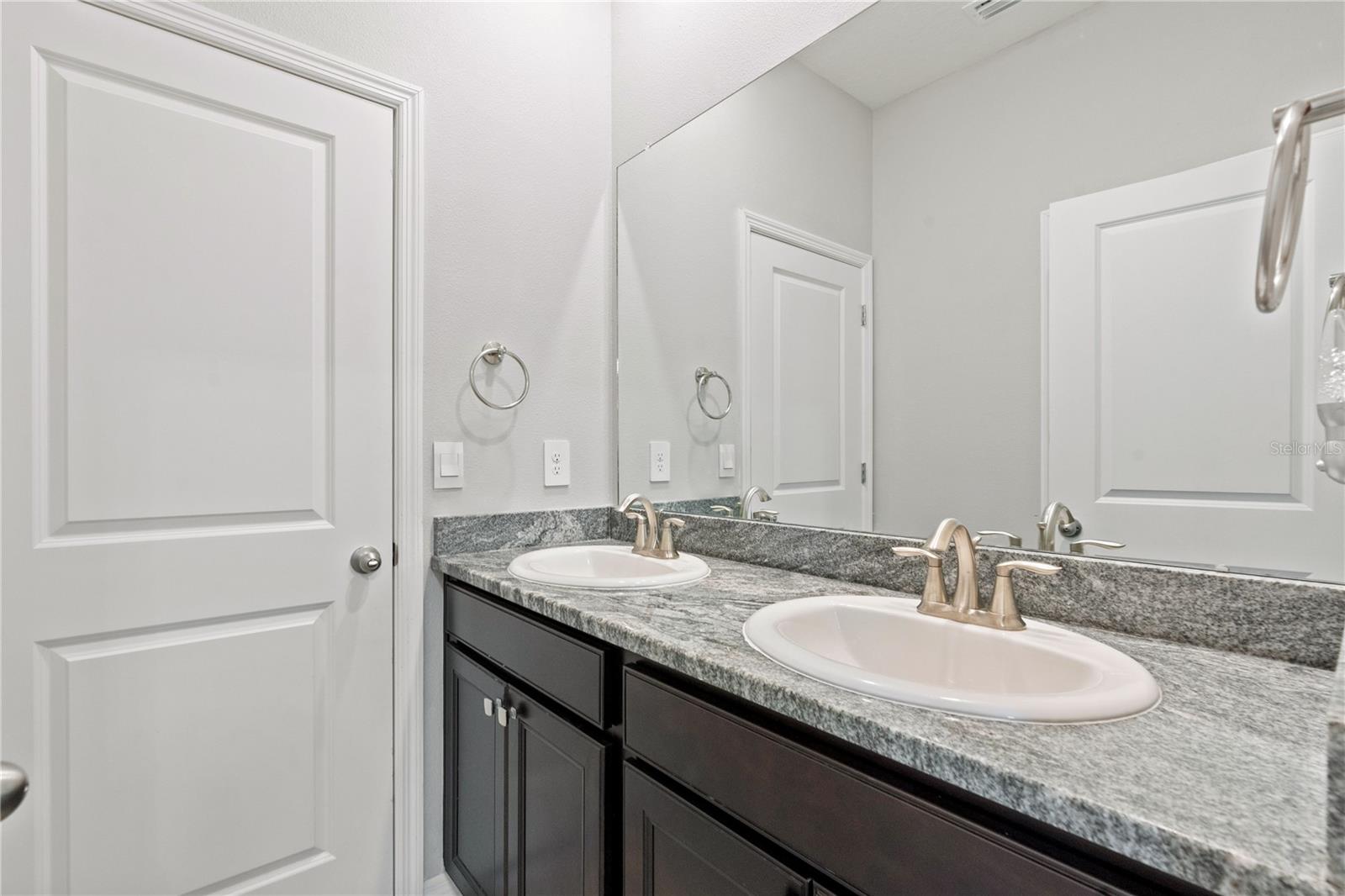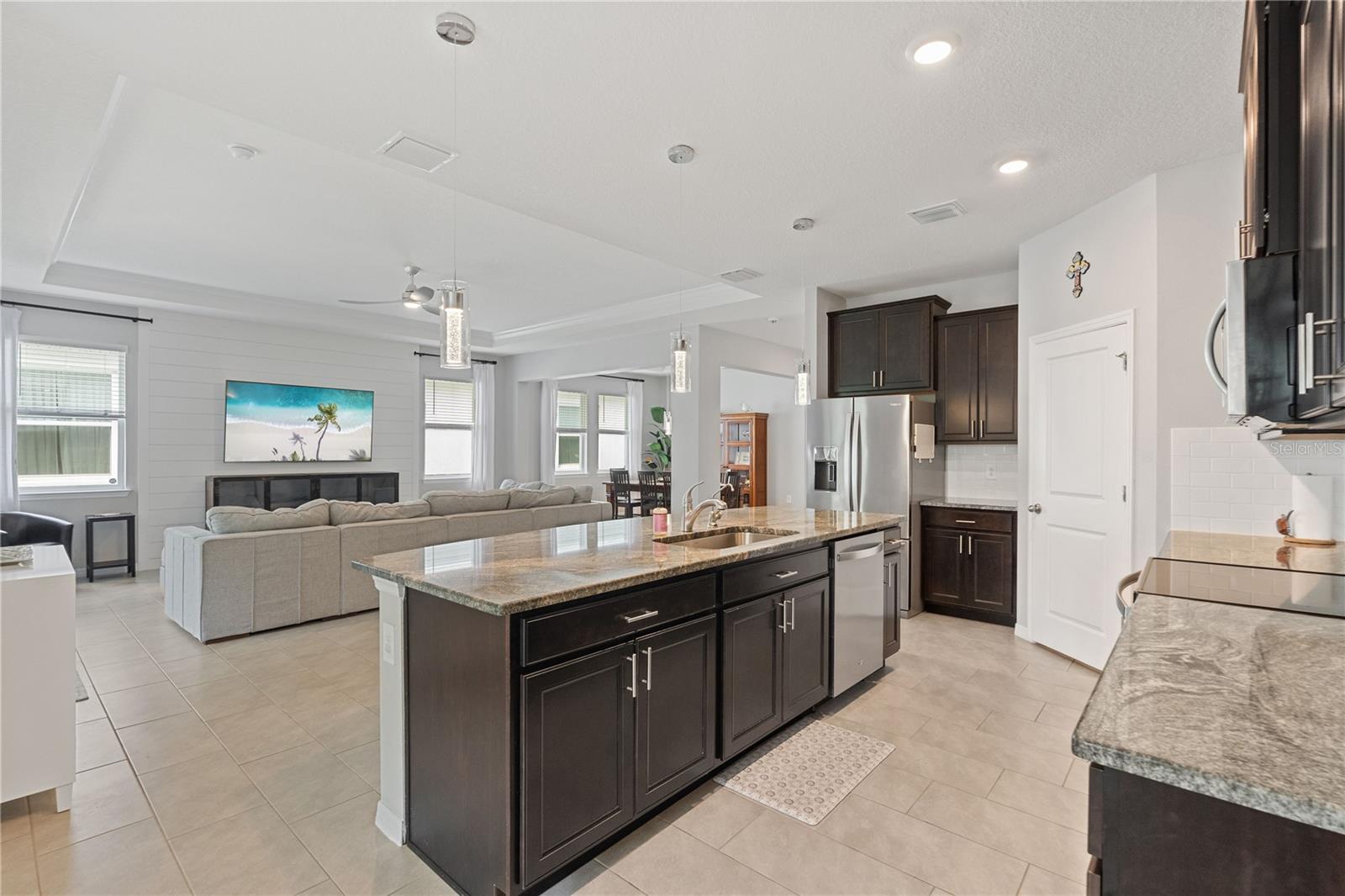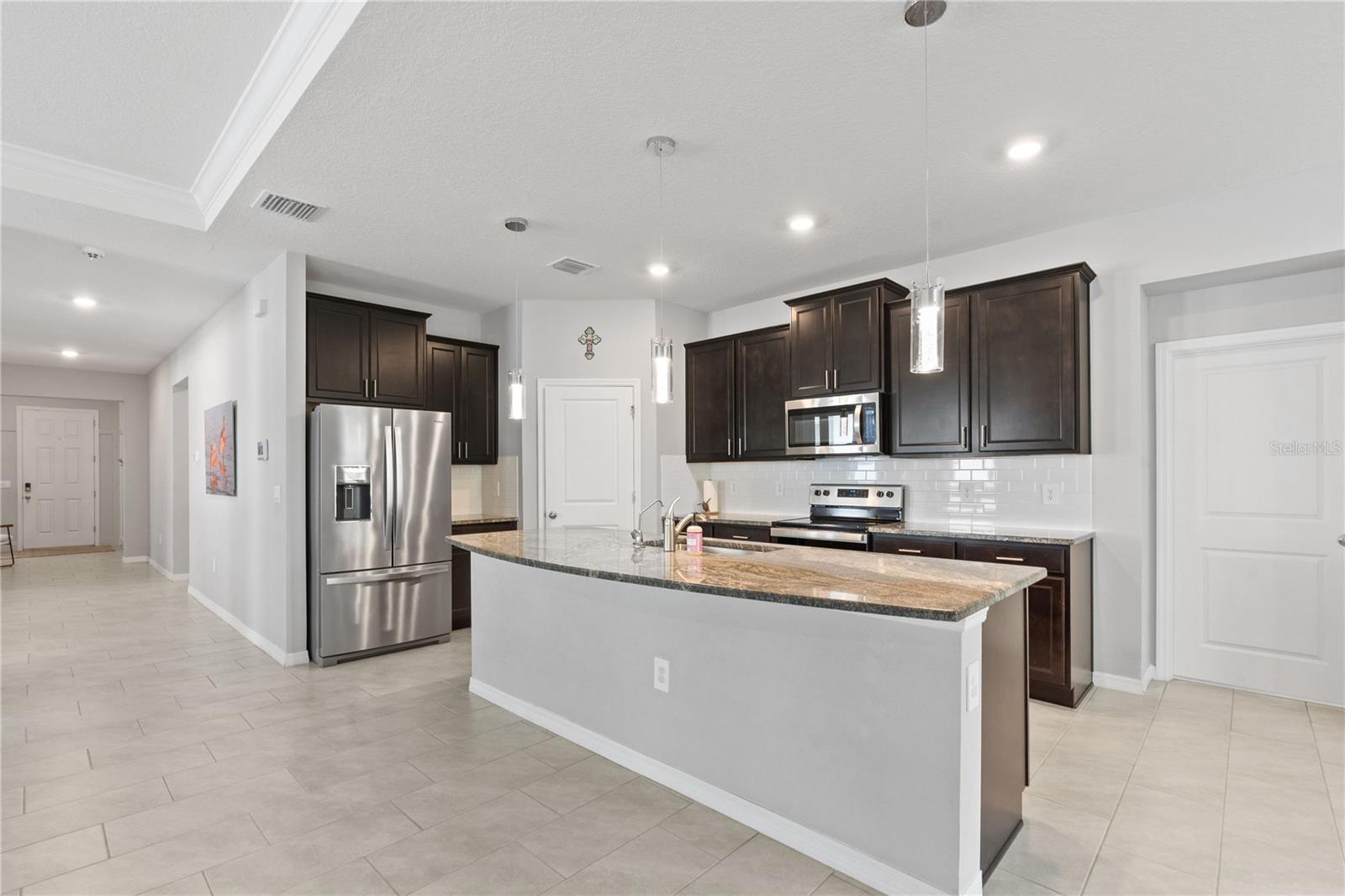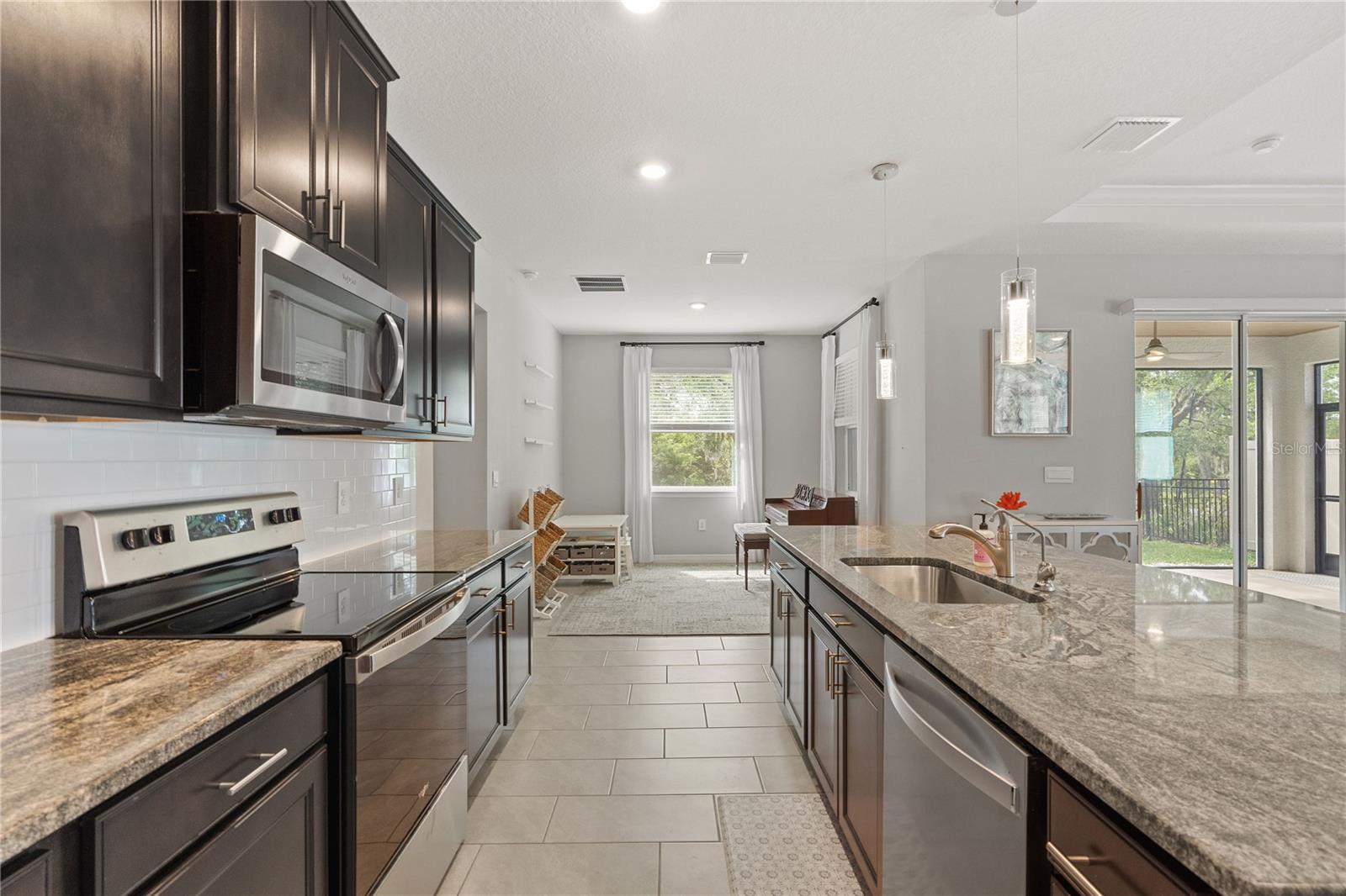 The kitchen is a culinary dream, with granite countertops, upgraded cabinetry, high-end appliances, and designer fixtures.