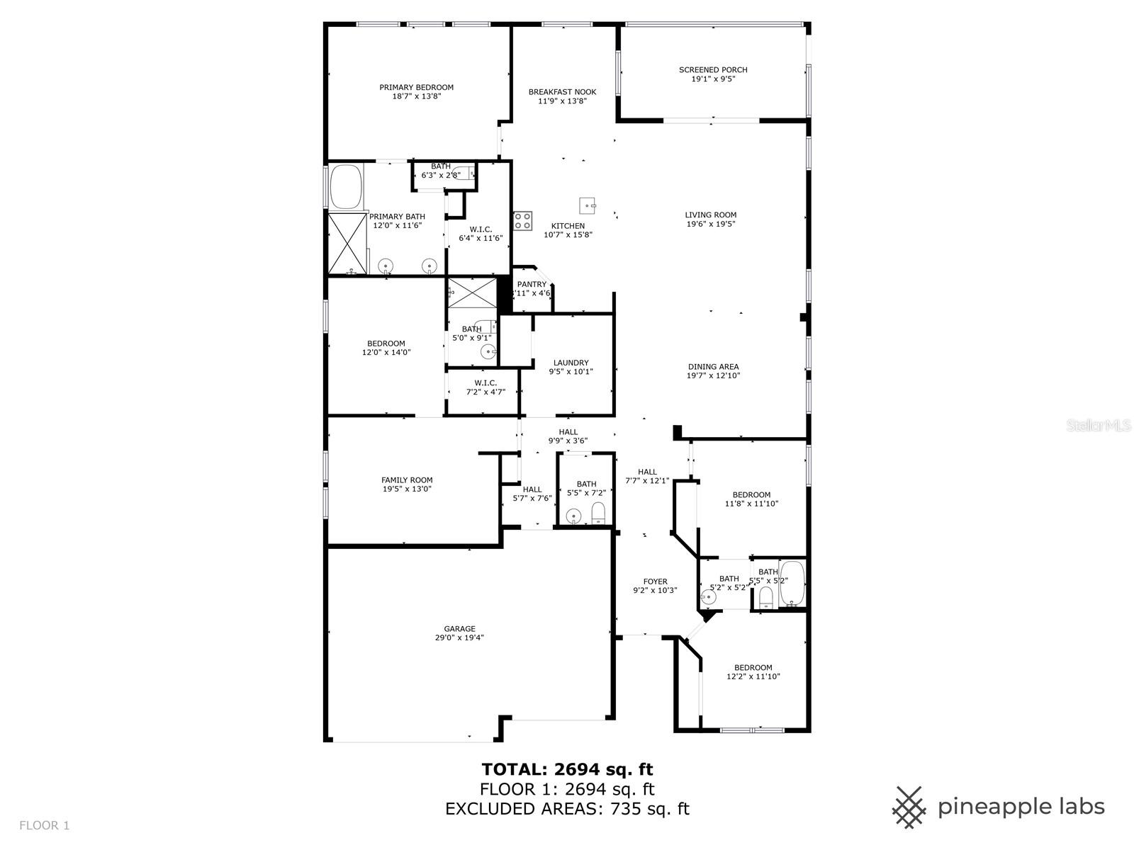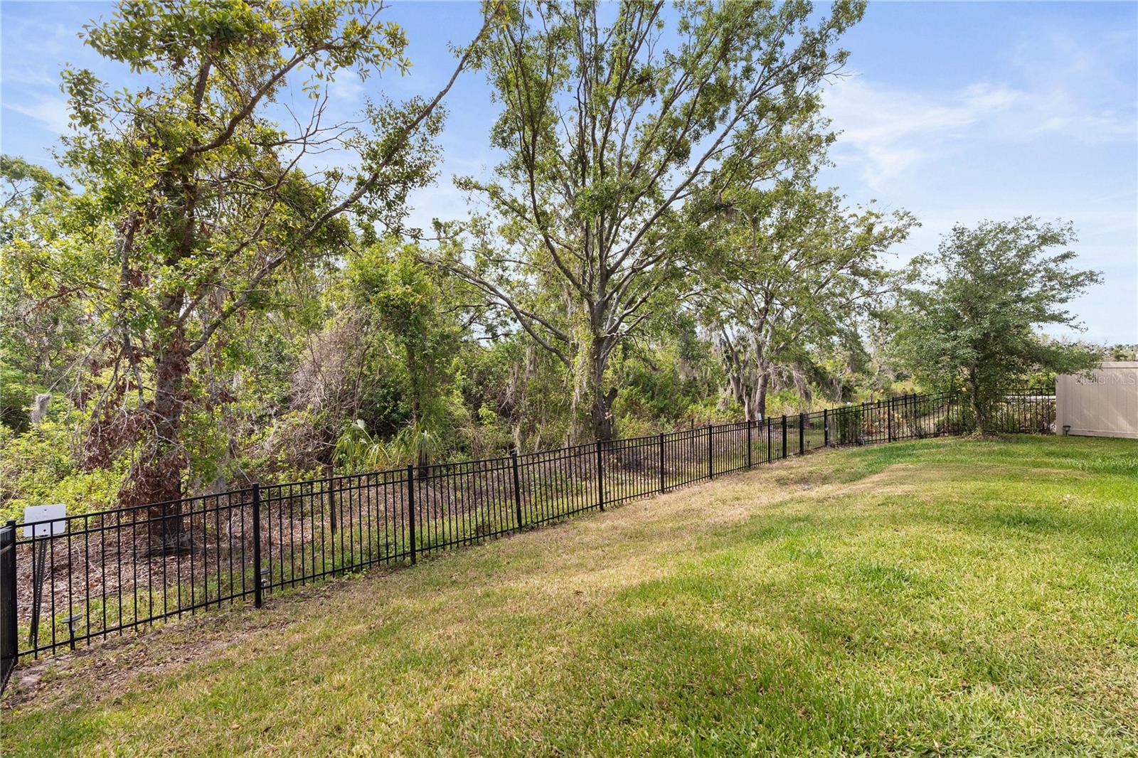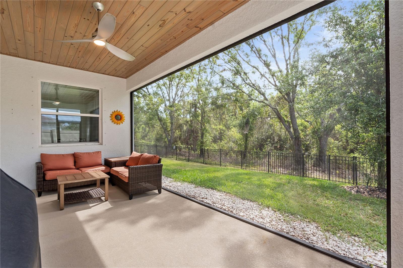 Screened-in lanai overlooking a large backyard that borders a conservation area, offering privacy, tranquility, and excellent bird-watching