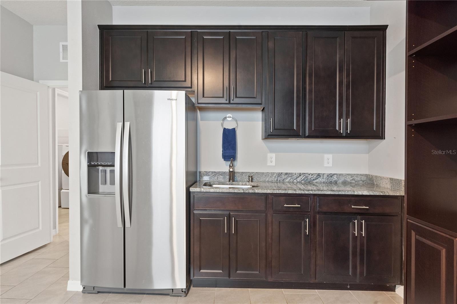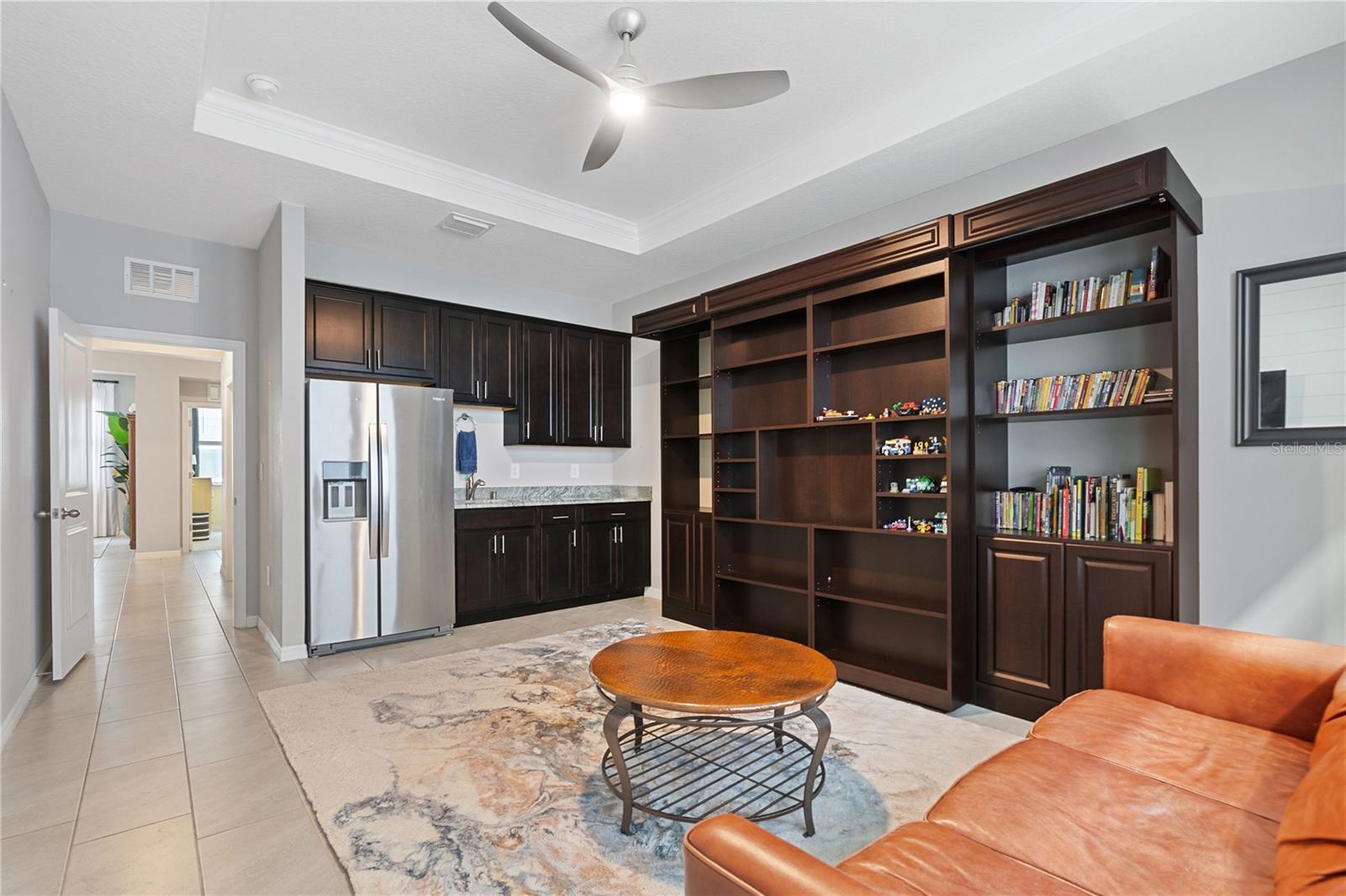 A standout feature is the upgraded bonus room, styled like an in-law apartment. This area is equipped with a fridge, wet bar, and mini-kitchenette and includes a flex room that can serve as a guest bedroom, home office, gym, or personal retreat, offering unmatched versatility.