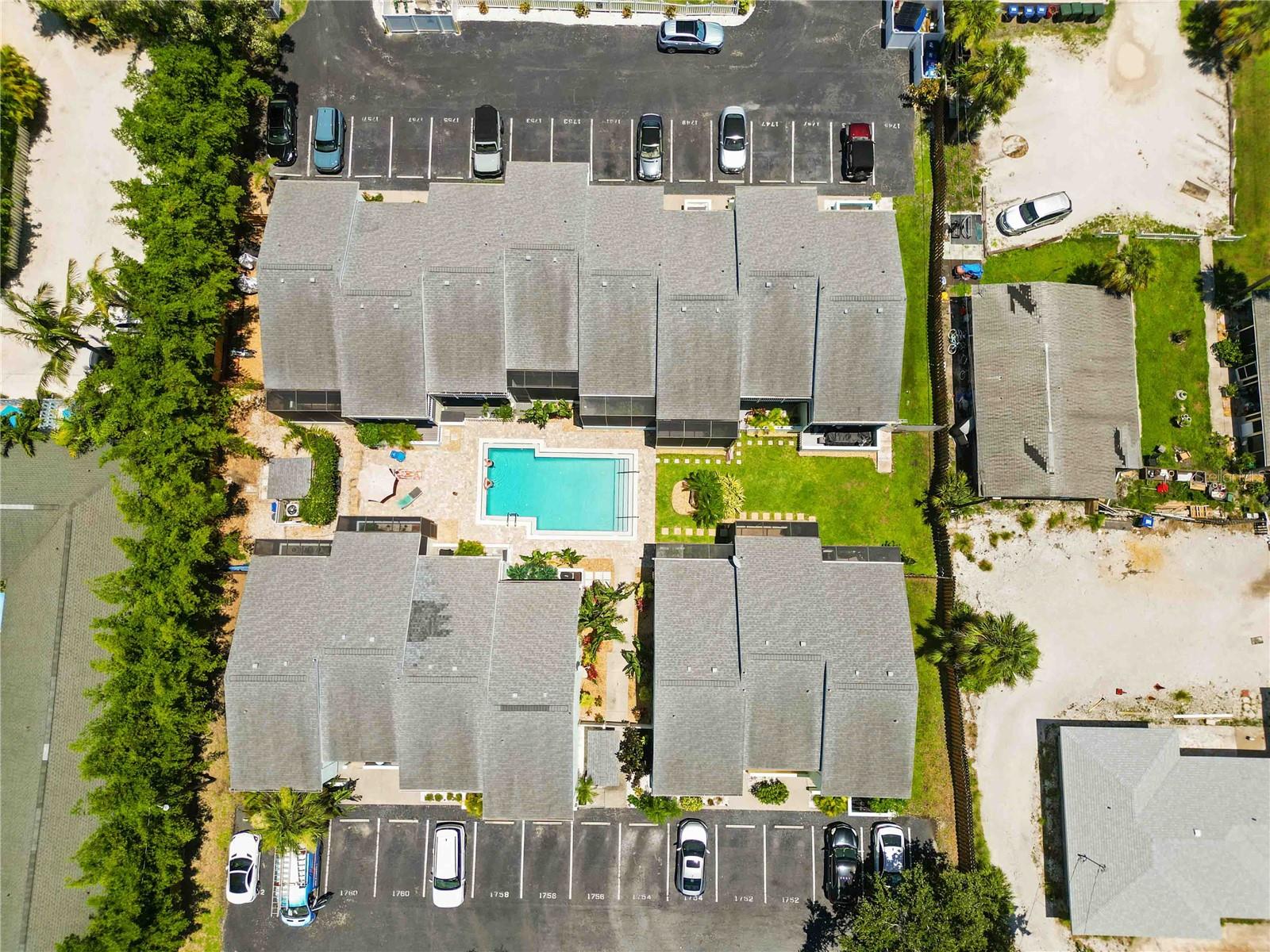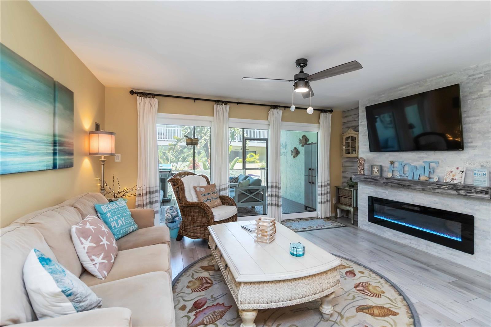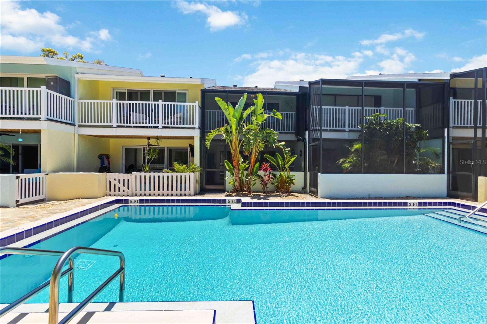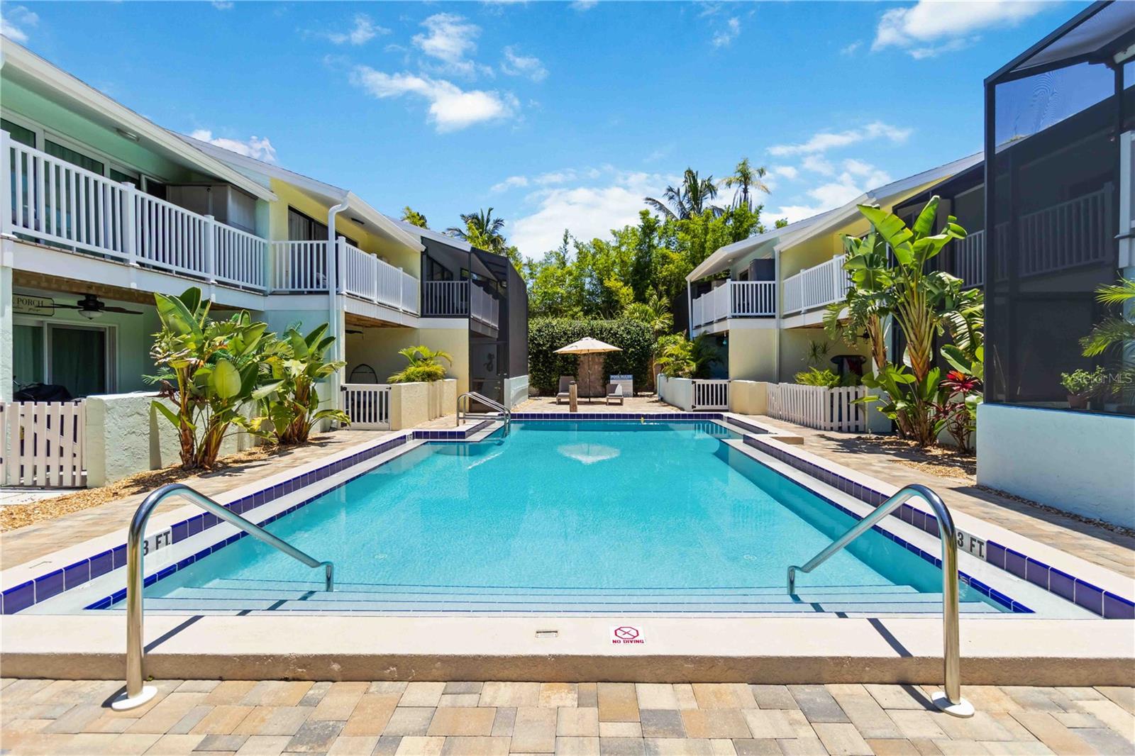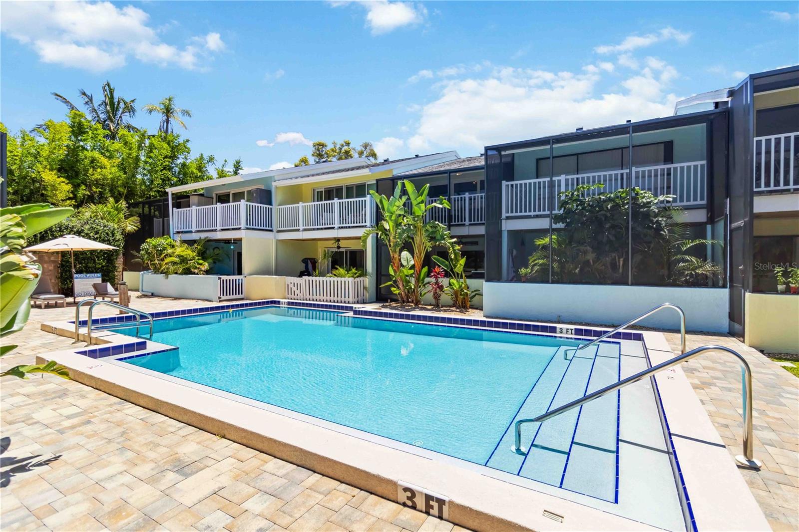 Welcome to Key Point Village, a peaceful, pet-friendly enclave located just over the South Bridge from world-renowned Siesta Key Beach. This rarely available 2-bedroom, 1.5-bath townhome-style condo offers over 1,000 square feet of stylish, updated living space across two levels--perfect for full-time residents or seasonal escapes. Step inside to find an open floorplan with modern finishes, including vinyl and tile flooring throughout. The kitchen is a showstopper with a large center island, sleek countertops, and stainless steel appliances. An adjacent dining space flows seamlessly into the living room, which features an electric fireplace and sliding glass doors leading to the oversized screened lanai--ideal for morning coffee or entertaining guests. Upstairs, you'll find both spacious bedrooms with built-in closets and access to a full bath. The primary bedroom offers direct access to a screened-in balcony overlooking the pool--perfect for morning coffee or winding down at sunset. A convenient half-bath is located downstairs for guests and everyday use. This unit comes with two assigned parking spaces, and the community offers a heated pool just steps from your lanai surrounded by lush, tropical landscaping. Enjoy peace of mind with hurricane rated windows and doors, and enjoy a carefree lifestyle with HOA fees covering water, sewer, trash, pest control, exterior maintenance, and more. Zoned for highly rated Gulf Gate Elementary, Brookside Middle, and Riverview High, this location also offers easy access to shopping, dining, and downtown Sarasota. Whether you're seeking a low-maintenance beach retreat or your next investment, this move-in ready condo in a prime Sarasota location checks all the boxes.