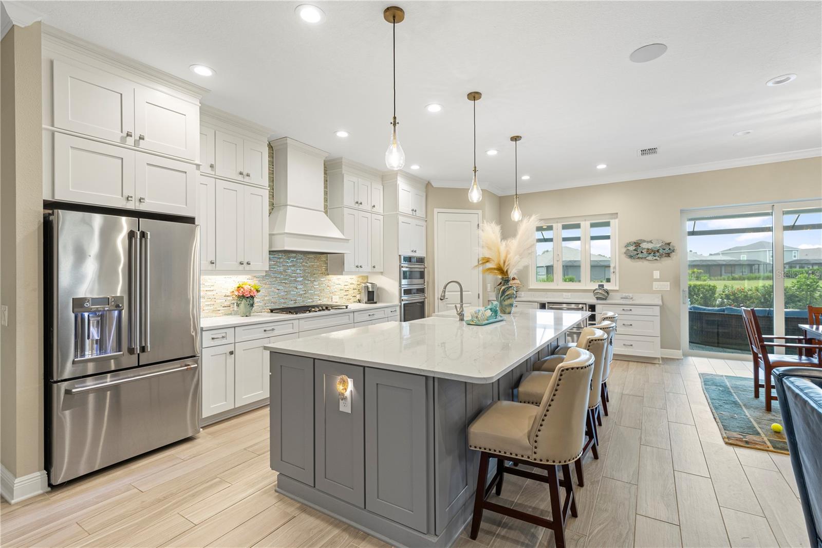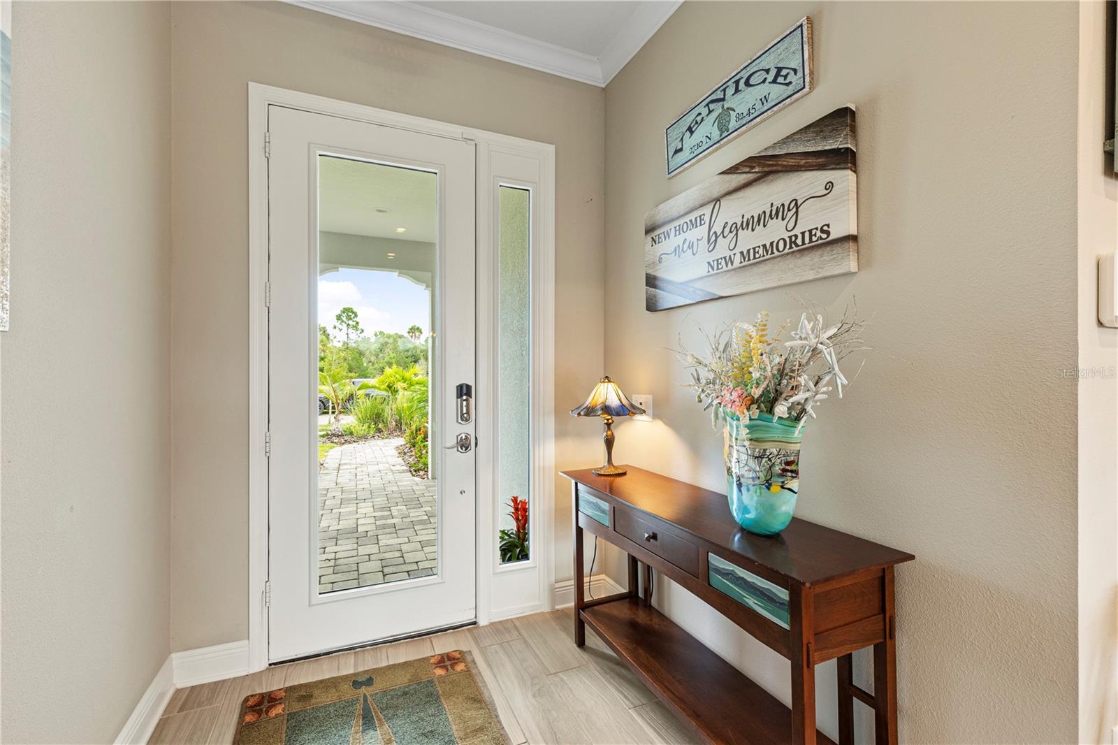The open design is filled with natural light and elevated by crown molding, upgraded lighting, and statement chandeliers. The kitchen is equipped with all GE Smart appliances, including a GE Smart dishwasher, and a serving window for effortless entertaining. Hurricane-rated windows, electric shades, and Guardian protection with life alert add both comfort and security.