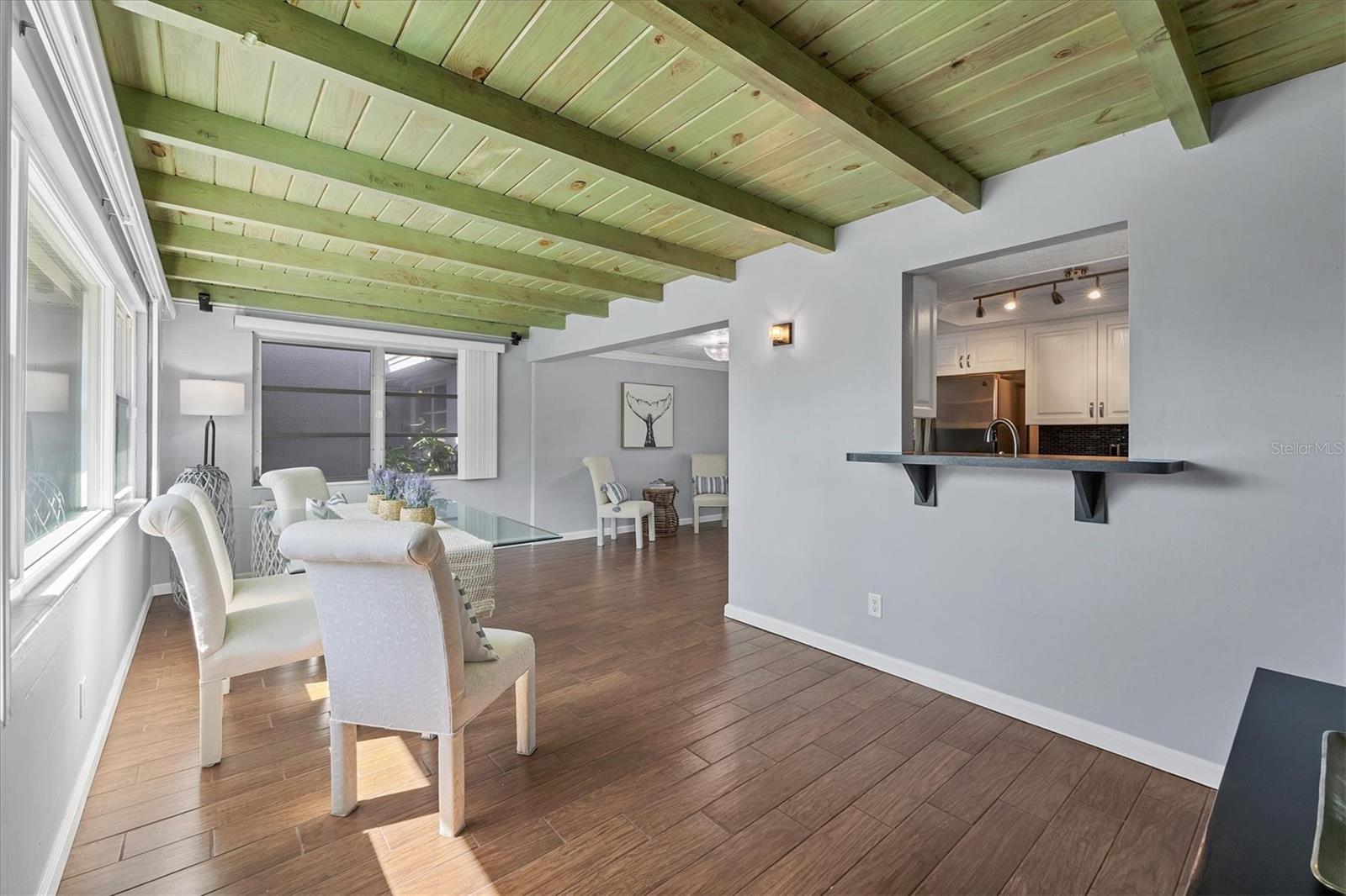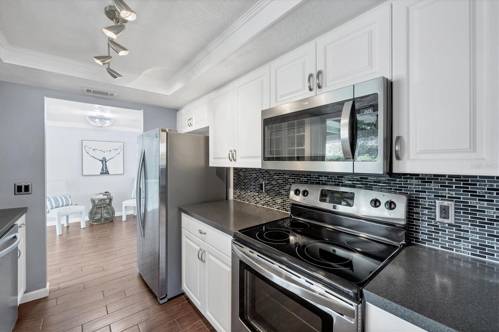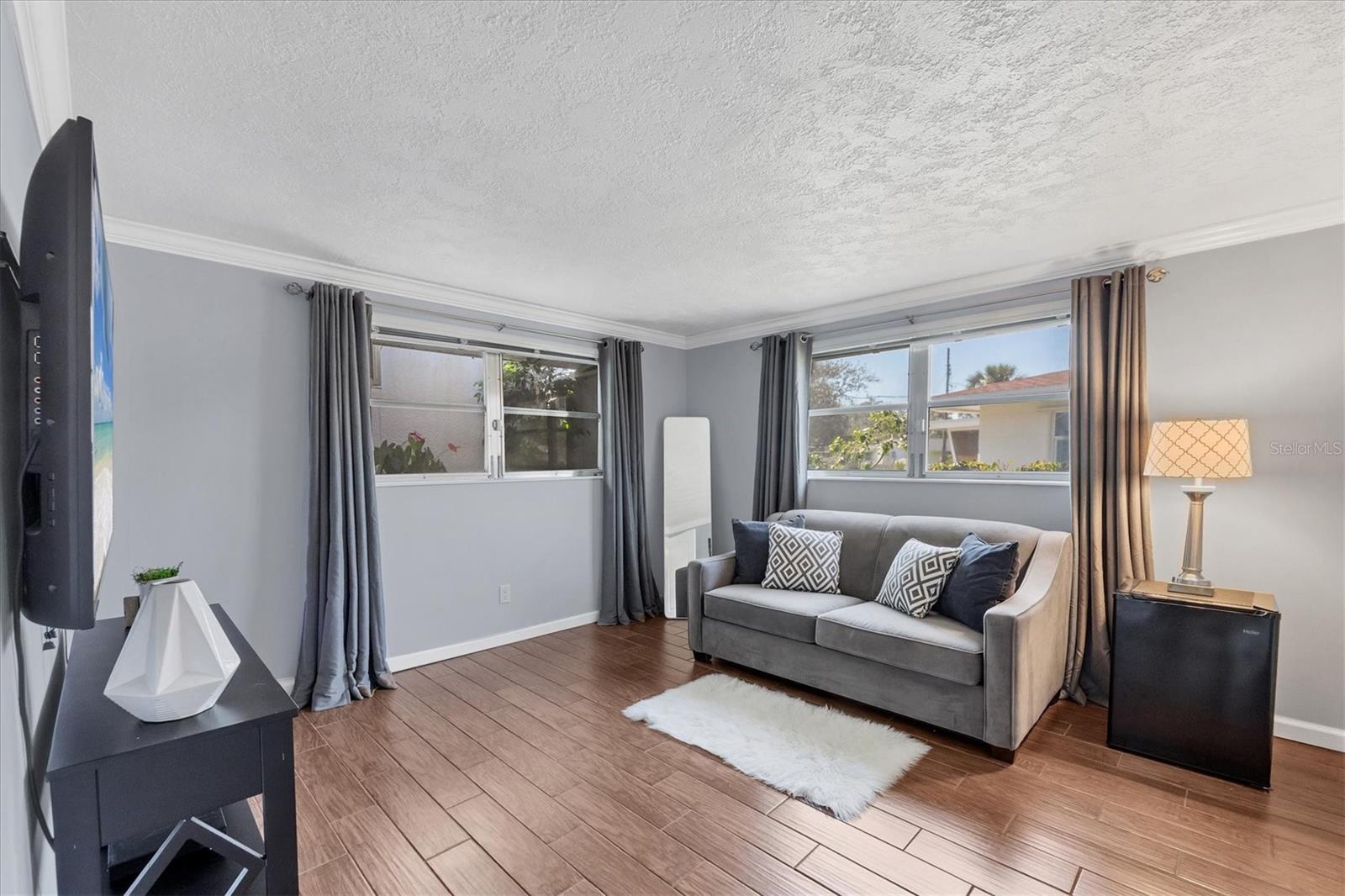 The bright and airy family room, with a built-in electric fireplace, is the perfect place to relax and entertain. A cozy space off the kitchen offers an area ideal for relaxing after a glorious day at the beach. The large second living space in the rear of the home offers versatility, whether you envision it as a dining area, office, or additional living space. Large plank, wood-inspired tile floors flow throughout the entire home creating a cohesive and inviting environment. Crown molding adds a lovely touch of sophistication.