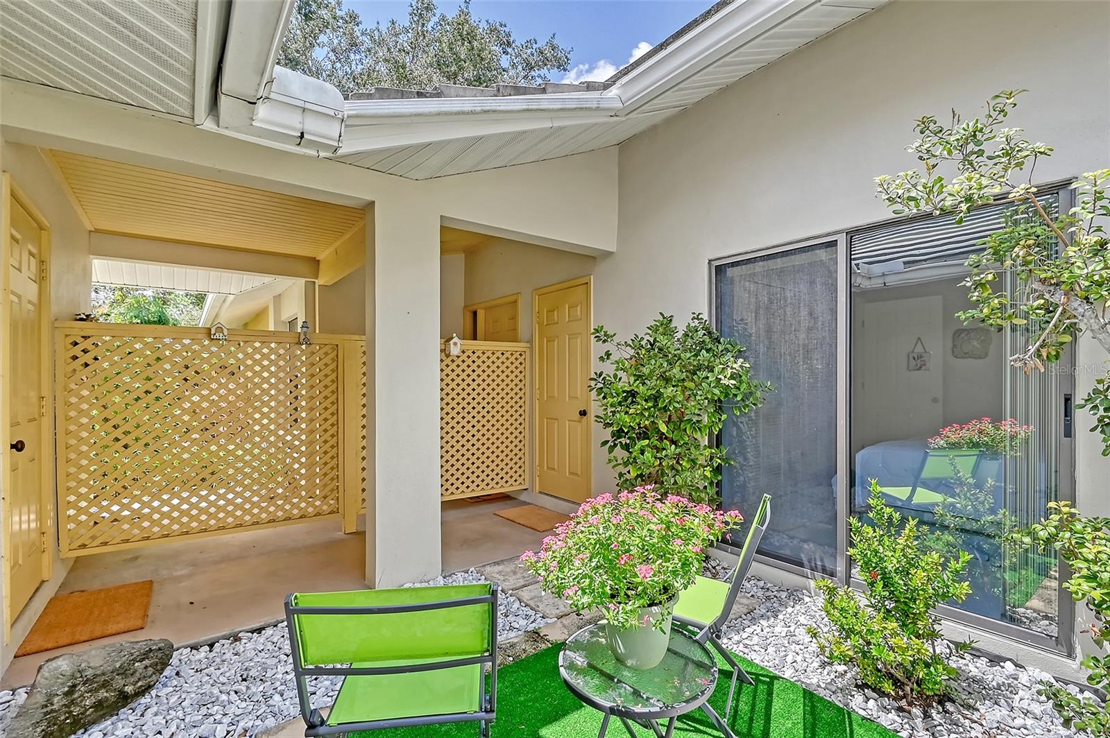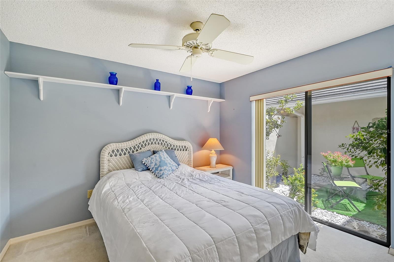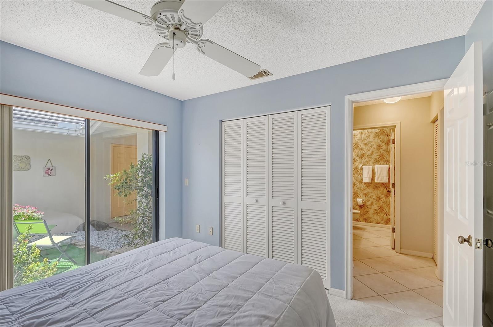 Retreat to the primary bedroom with an en-suite bath. The guest bedroom is equally spacious and offers a comfortable space for family or visitors with a view of the private courtyard.