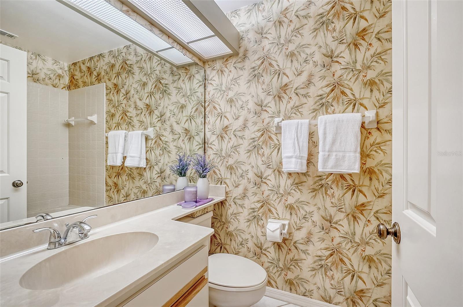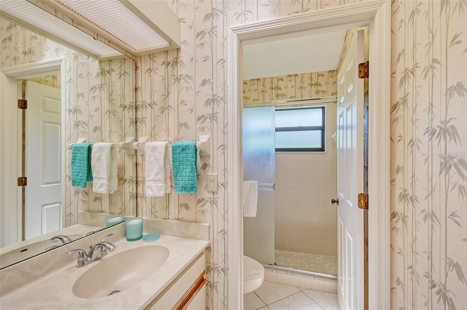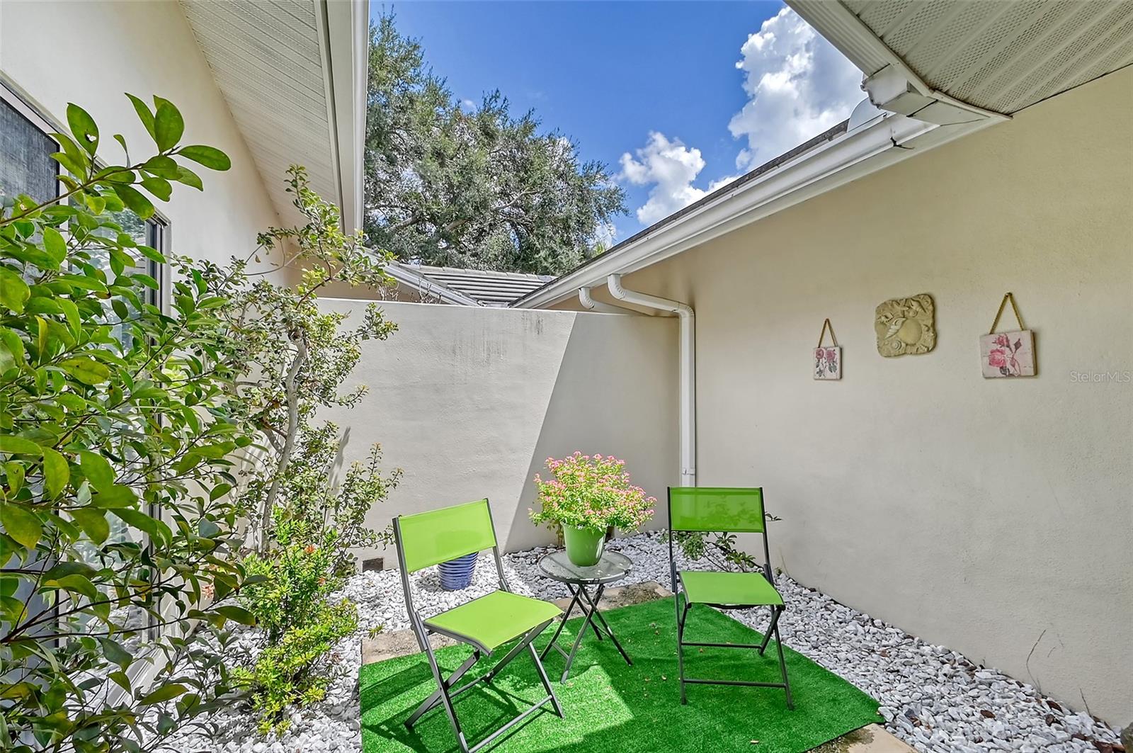 Retreat to the primary bedroom with an en-suite bath. The guest bedroom is equally spacious and offers a comfortable space for family or visitors with a view of the private courtyard.