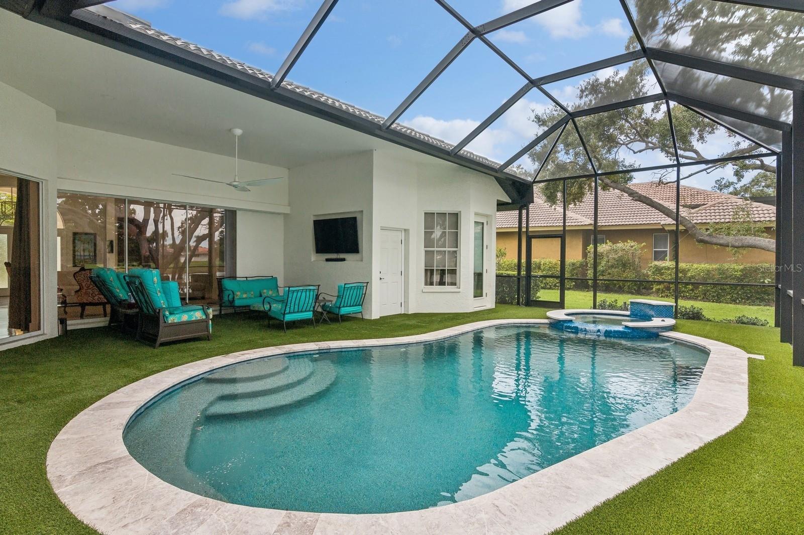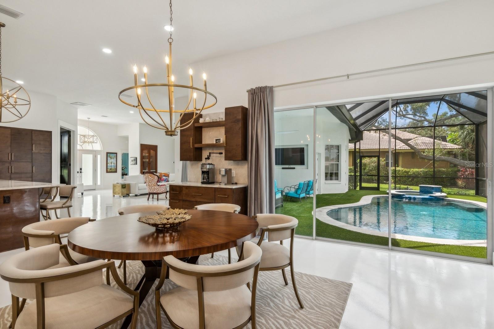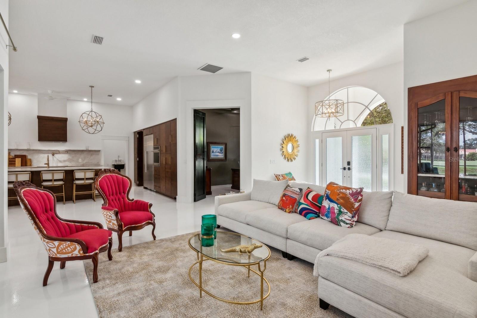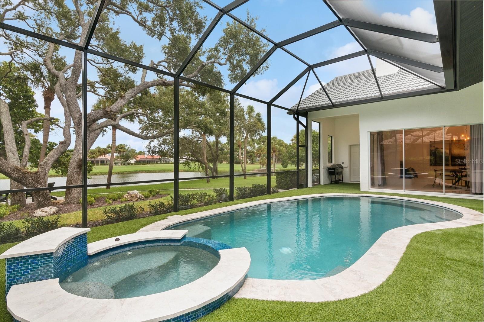 Luxury epoxy flooring enhances the foyer, while the living and dining rooms flow seamlessly to the outdoor space, where a redesigned pool, heated spa, and new protective cage overlook the serene golf course, ensuring privacy.