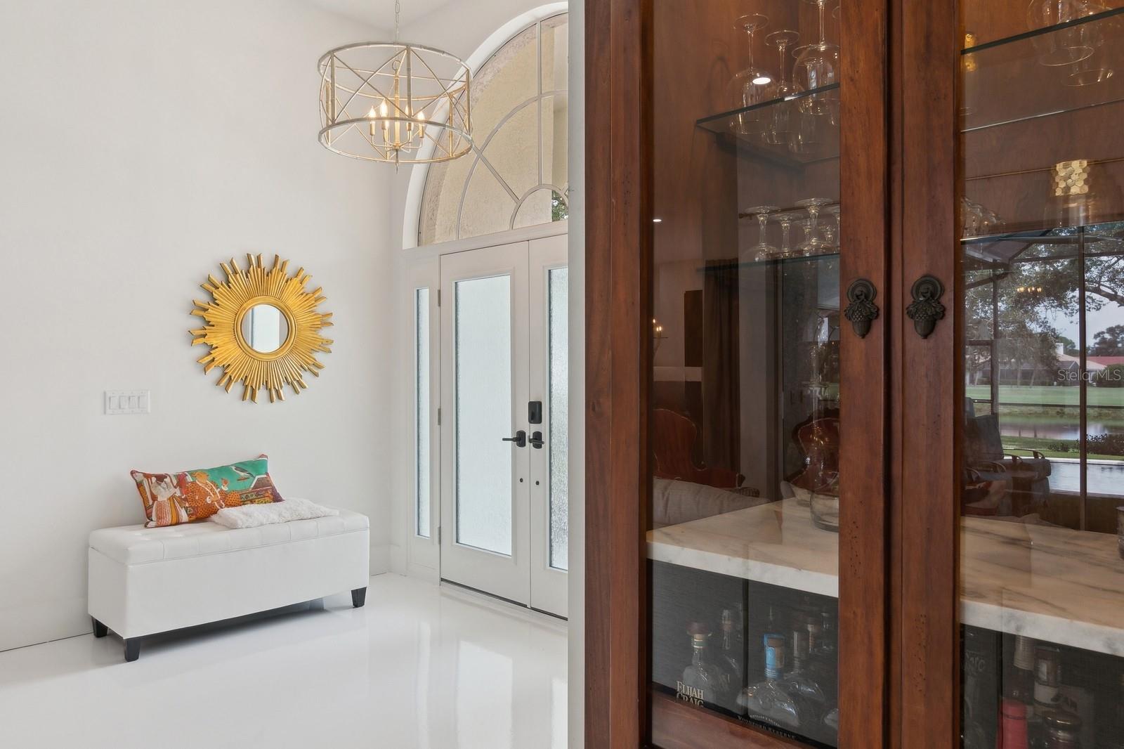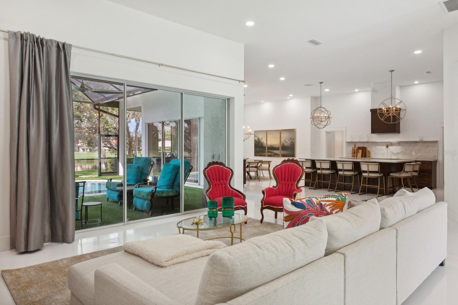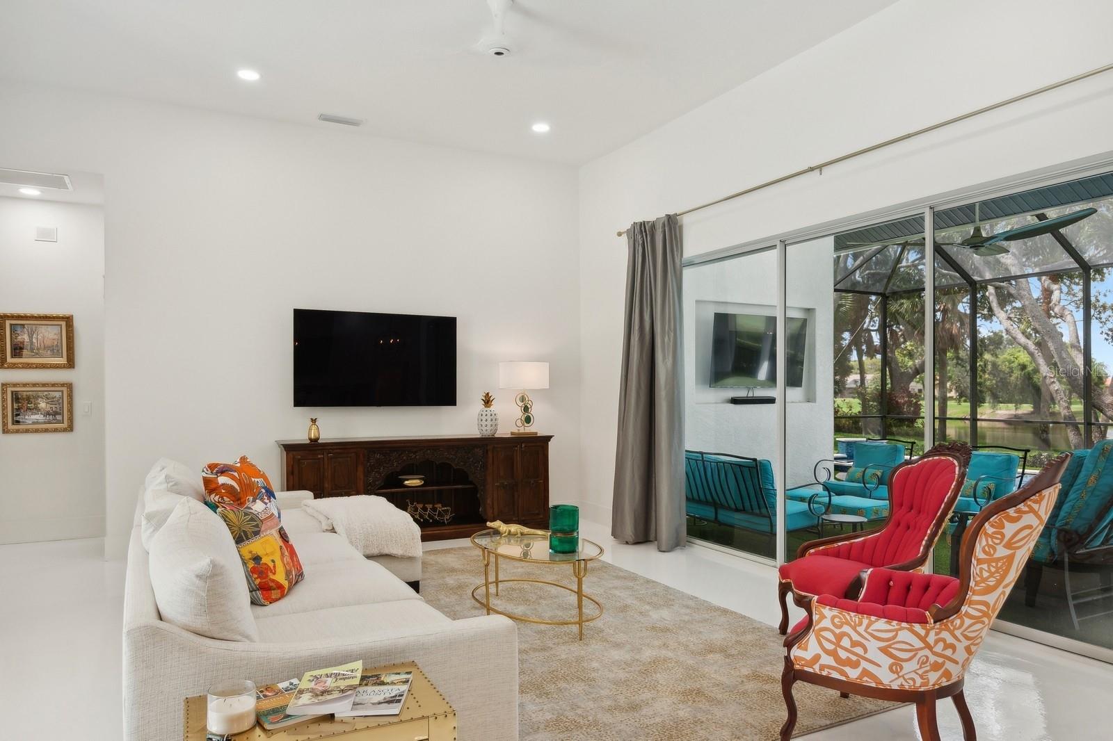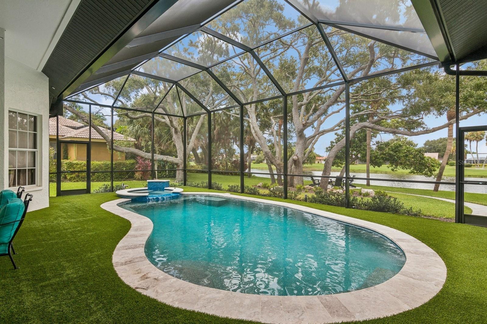 Luxury epoxy flooring enhances the foyer, while the living and dining rooms flow seamlessly to the outdoor space, where a redesigned pool, heated spa, and new protective cage overlook the serene golf course, ensuring privacy.