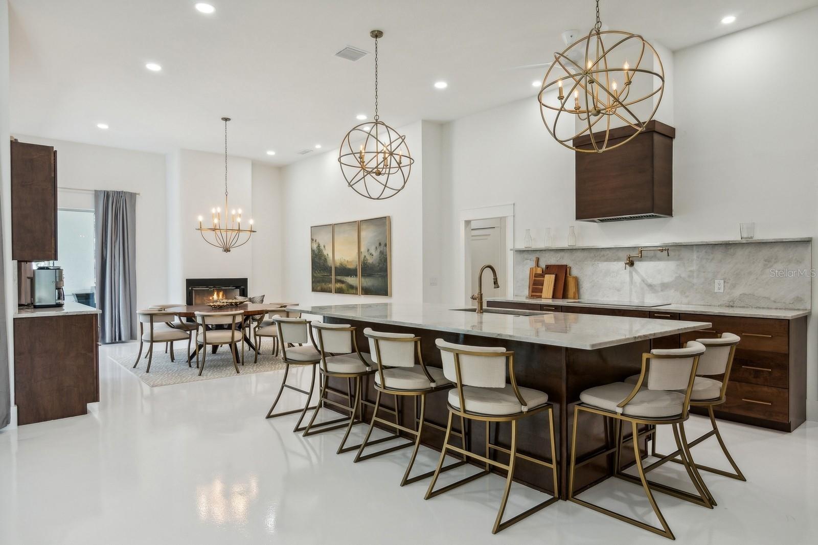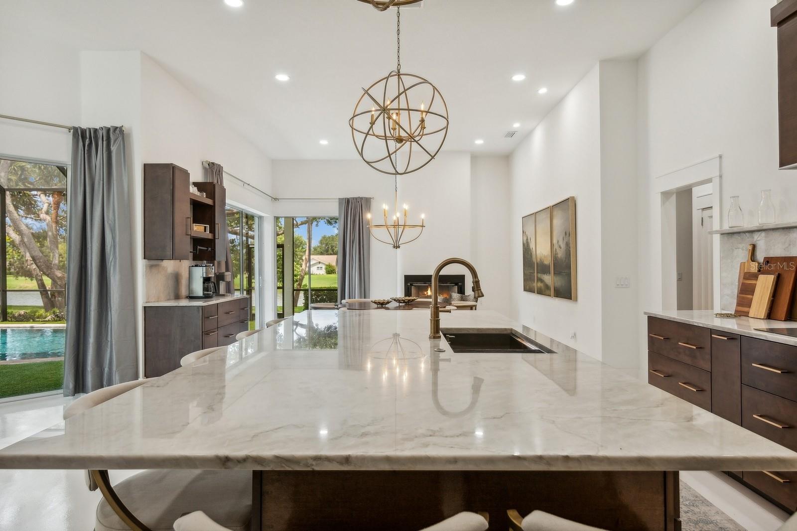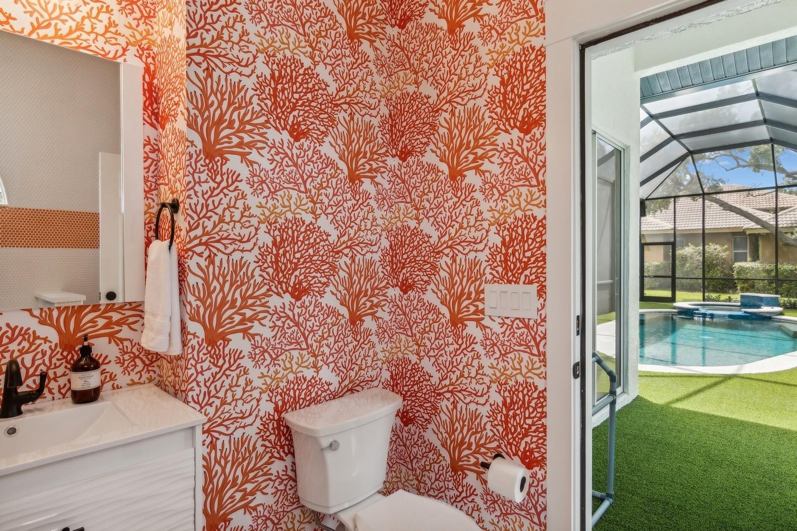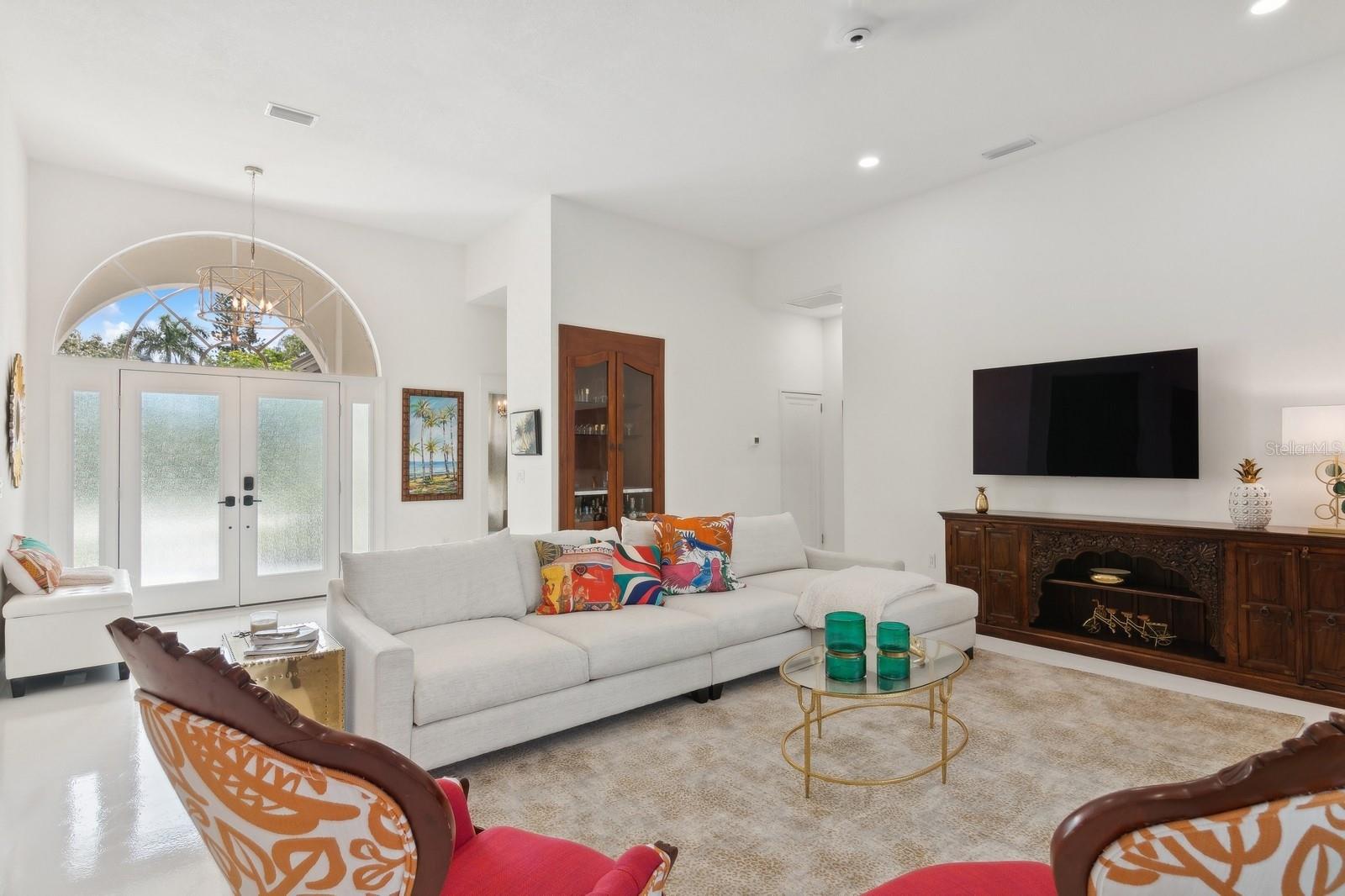 Luxury epoxy flooring enhances the foyer, while the living and dining rooms flow seamlessly to the outdoor space, where a redesigned pool, heated spa, and new protective cage overlook the serene golf course, ensuring privacy.