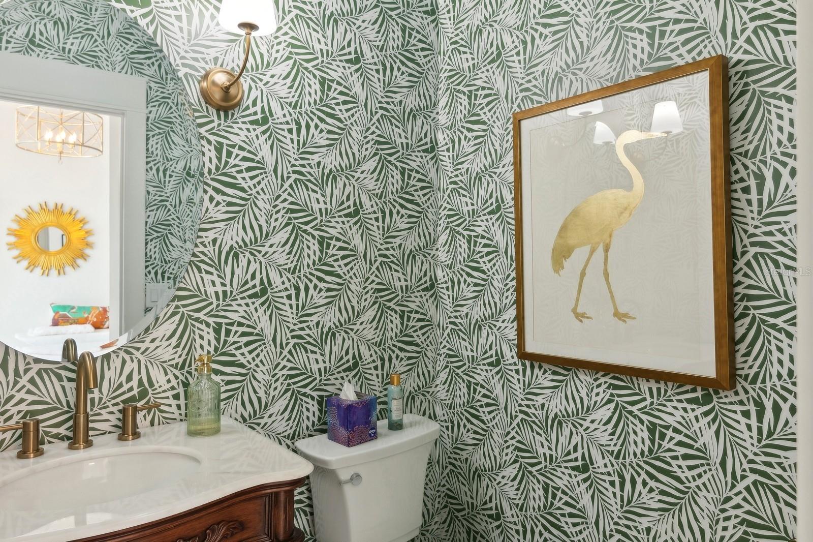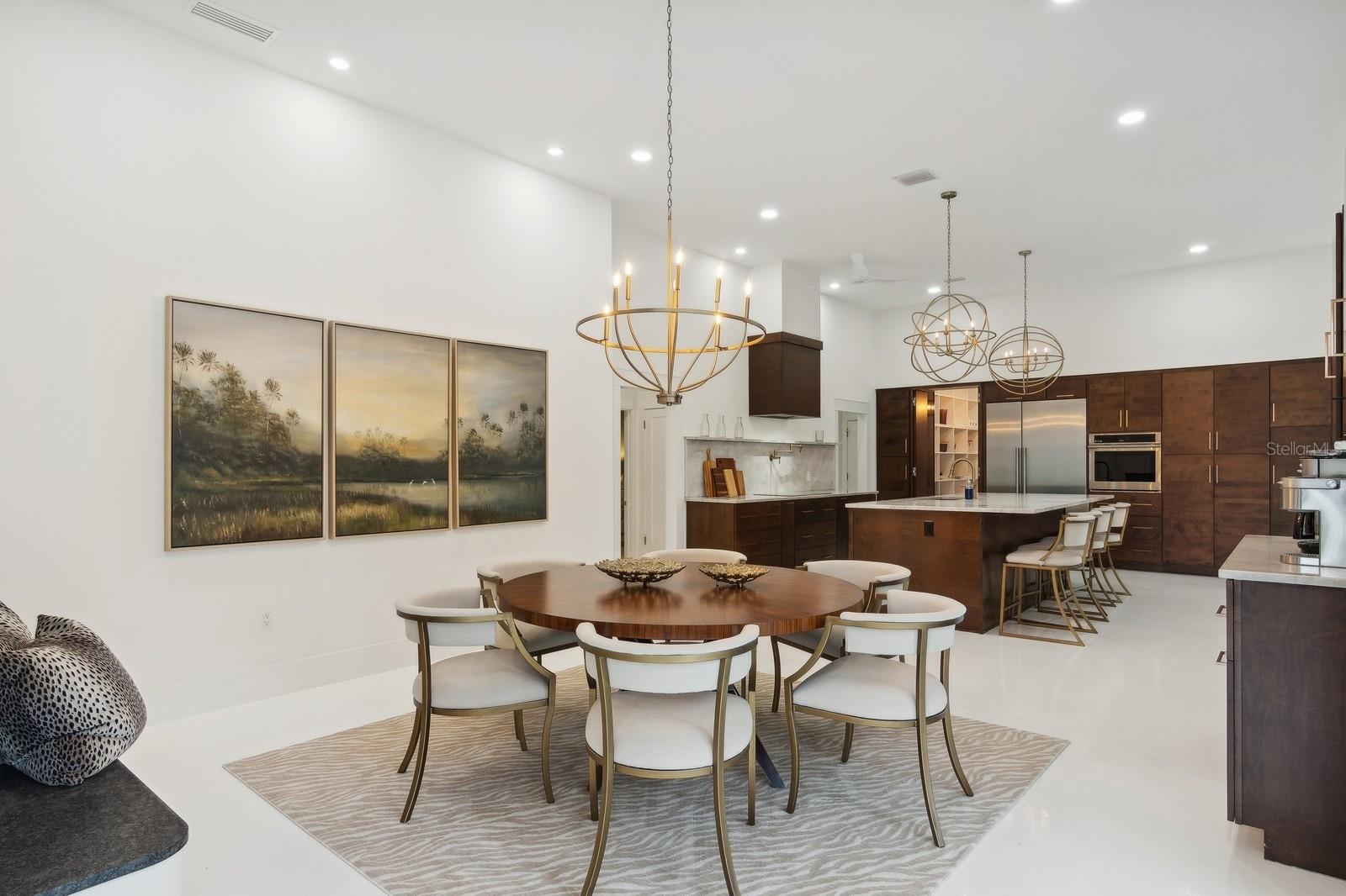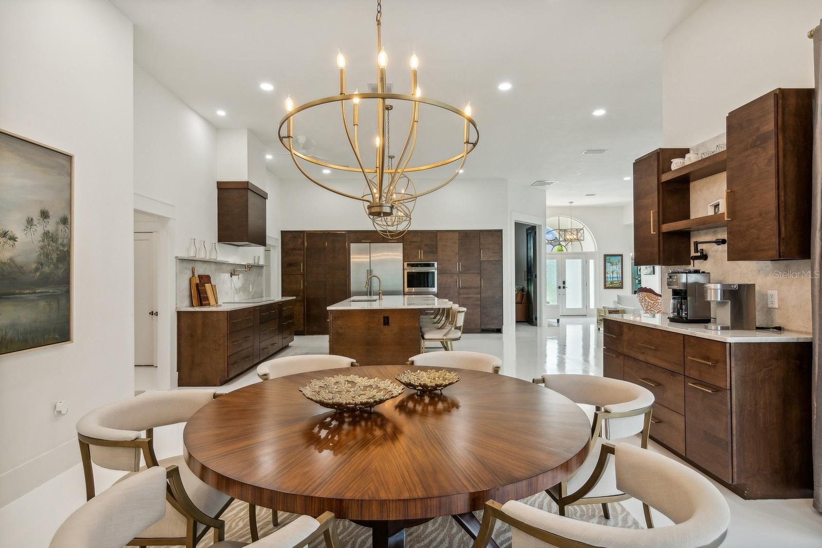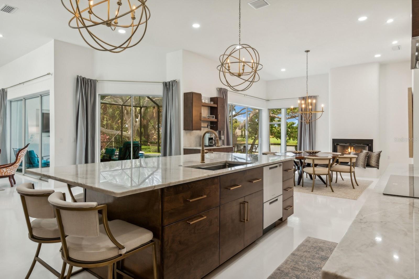 Luxury epoxy flooring enhances the foyer, while the living and dining rooms flow seamlessly to the outdoor space, where a redesigned pool, heated spa, and new protective cage overlook the serene golf course, ensuring privacy.
