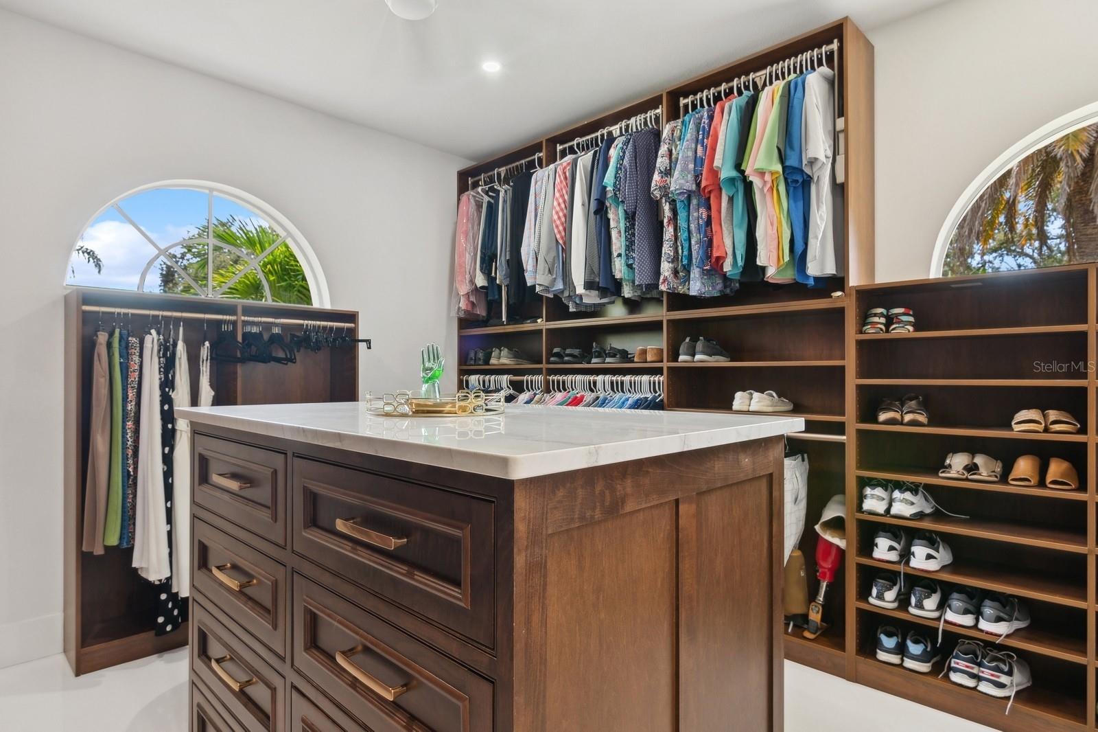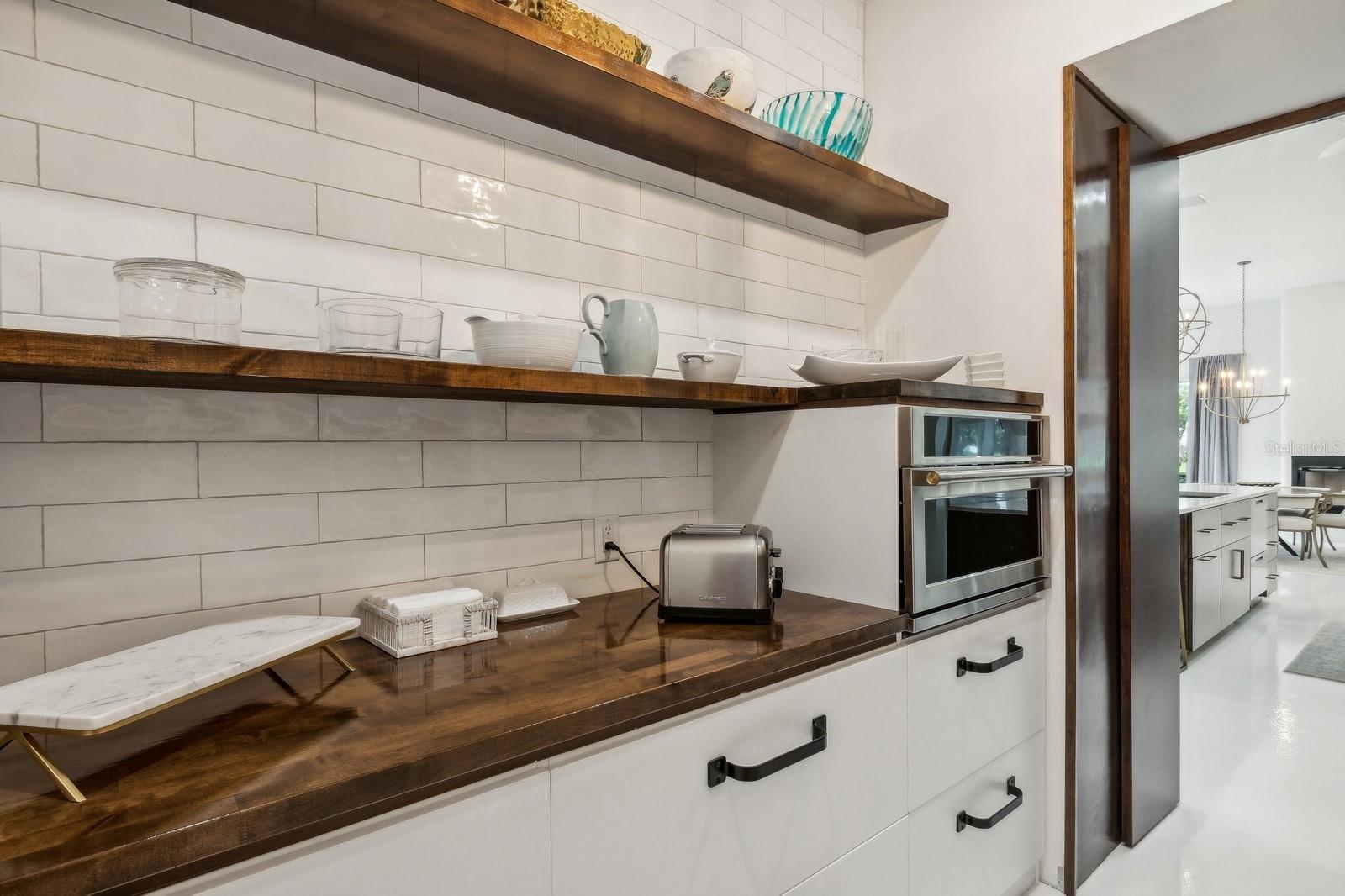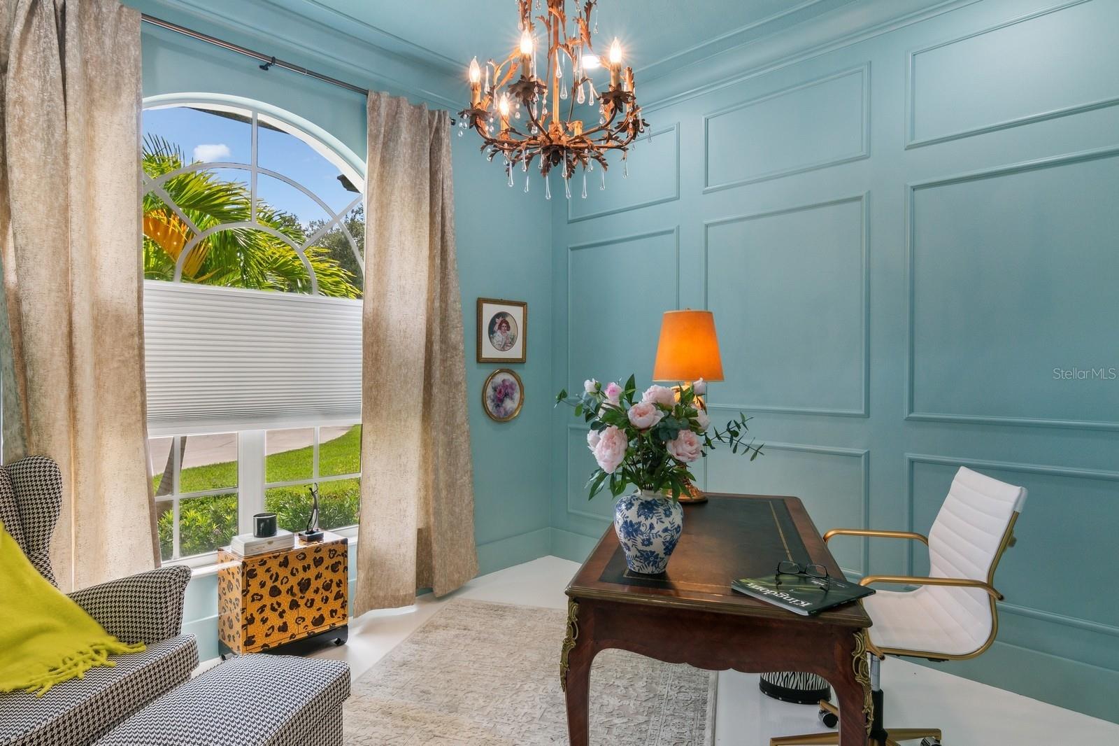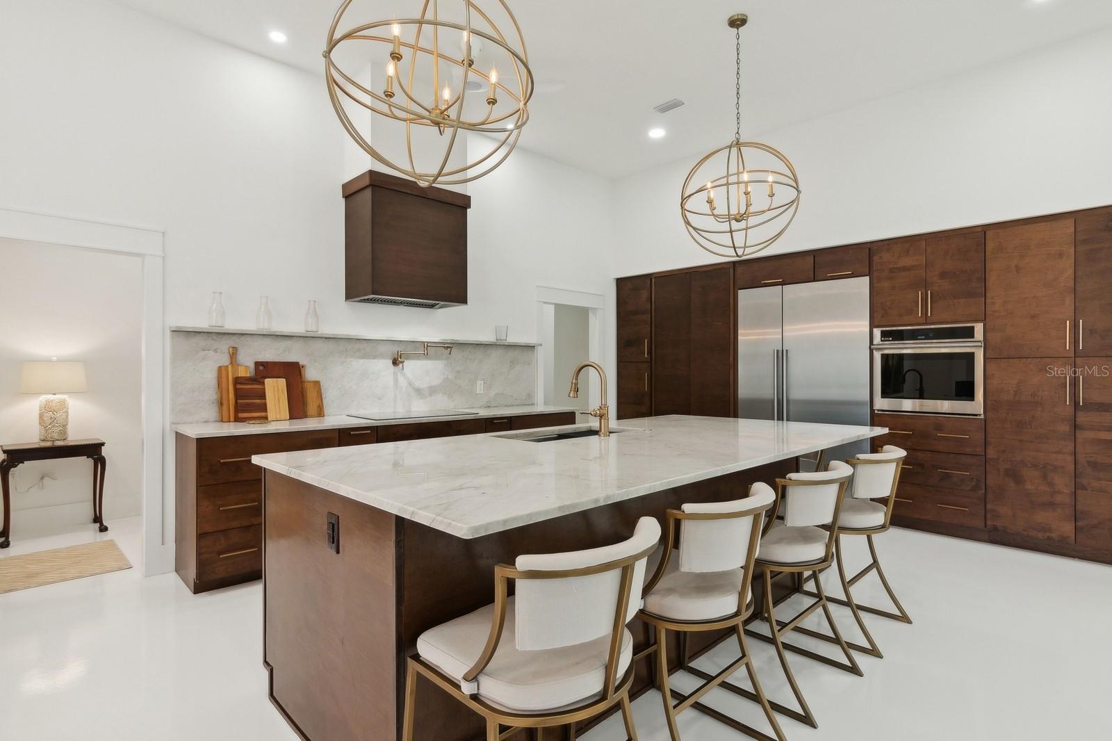 The guest wing includes three spacious bedrooms, each with ensuite bathrooms and walk-in closets. Two offices feature large arched windows, built-in cabinets, and antique wood doors worthy of a decor magazine. The open kitchen integrates dining, living, and outdoor spaces, featuring an oversized island with seating for six, Maplewood cabinetry, gray quartzite countertops, and luxury appliances for a curated blend of Kentucky craftsmanship and European design. The pantry offers ample storage with deep drawers and shelves.