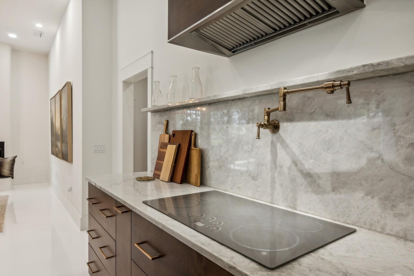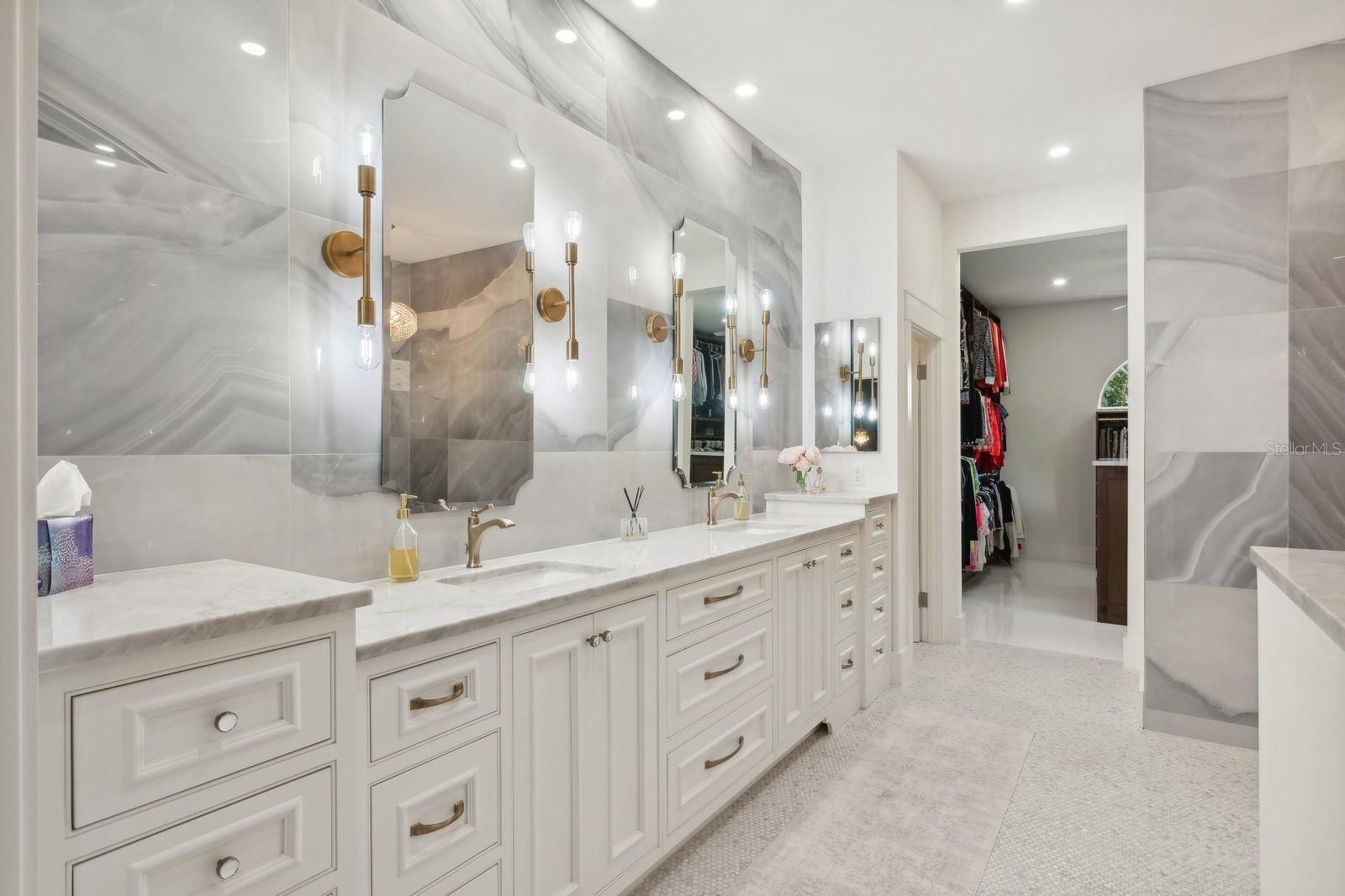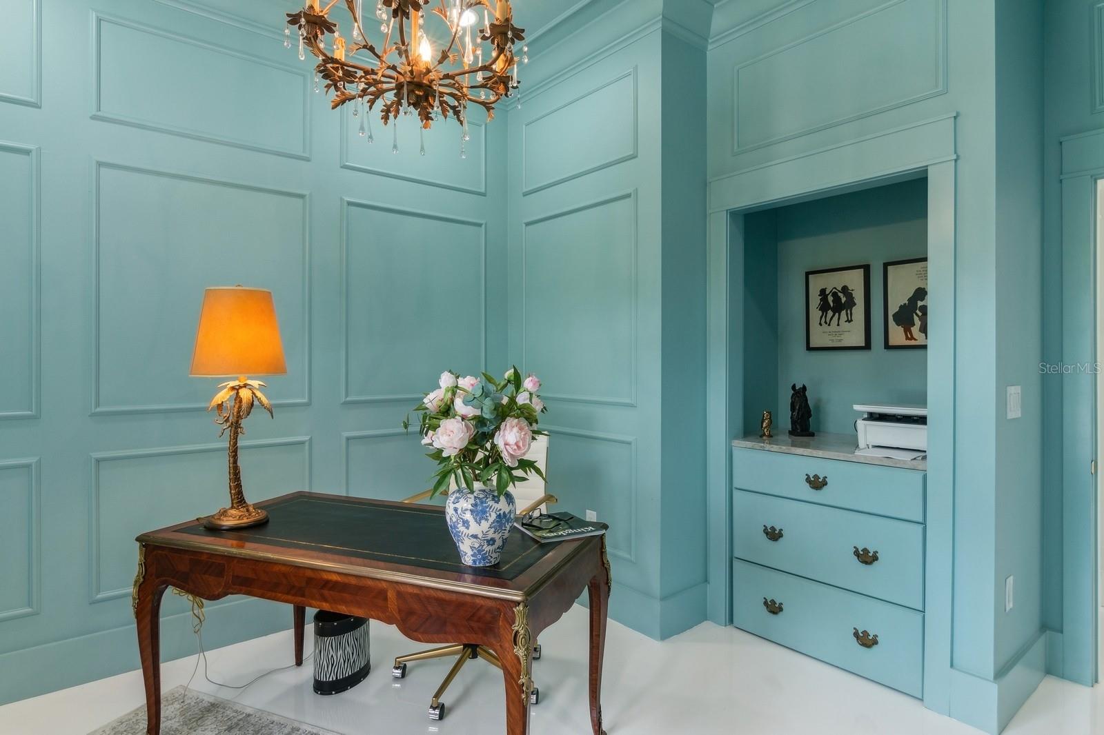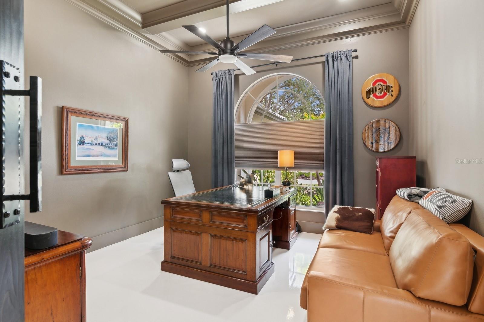 The guest wing includes three spacious bedrooms, each with ensuite bathrooms and walk-in closets. Two offices feature large arched windows, built-in cabinets, and antique wood doors worthy of a decor magazine. The open kitchen integrates dining, living, and outdoor spaces, featuring an oversized island with seating for six, Maplewood cabinetry, gray quartzite countertops, and luxury appliances for a curated blend of Kentucky craftsmanship and European design. The pantry offers ample storage with deep drawers and shelves.