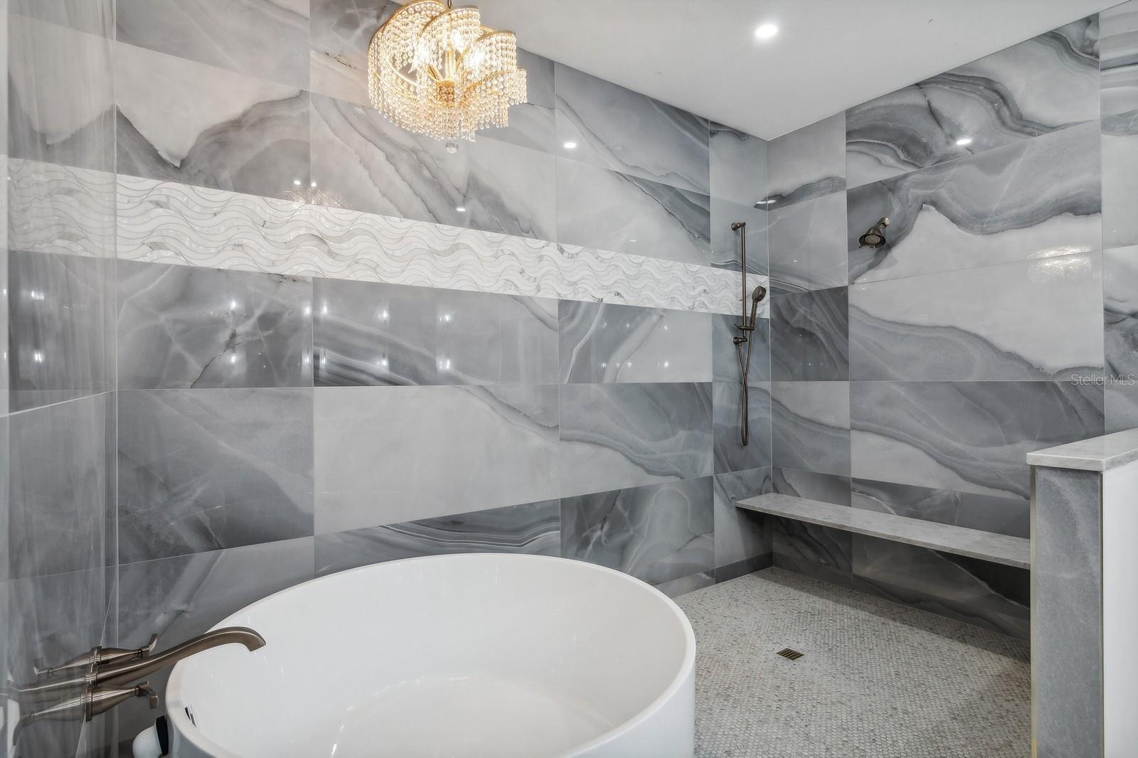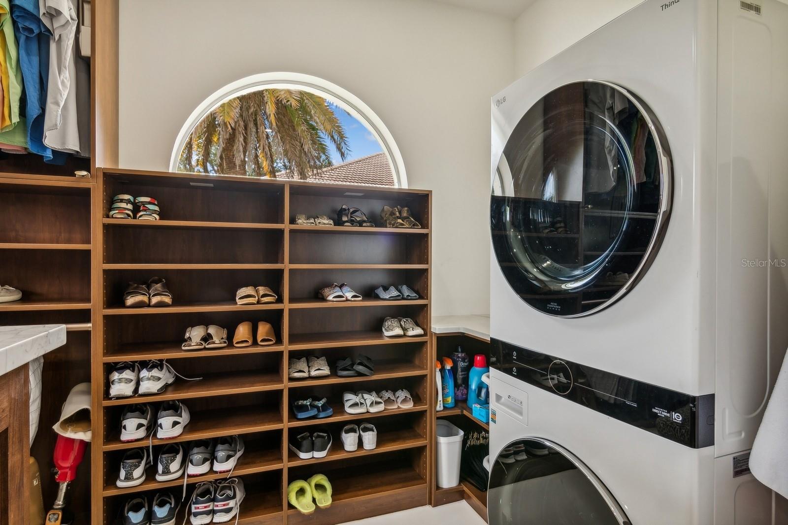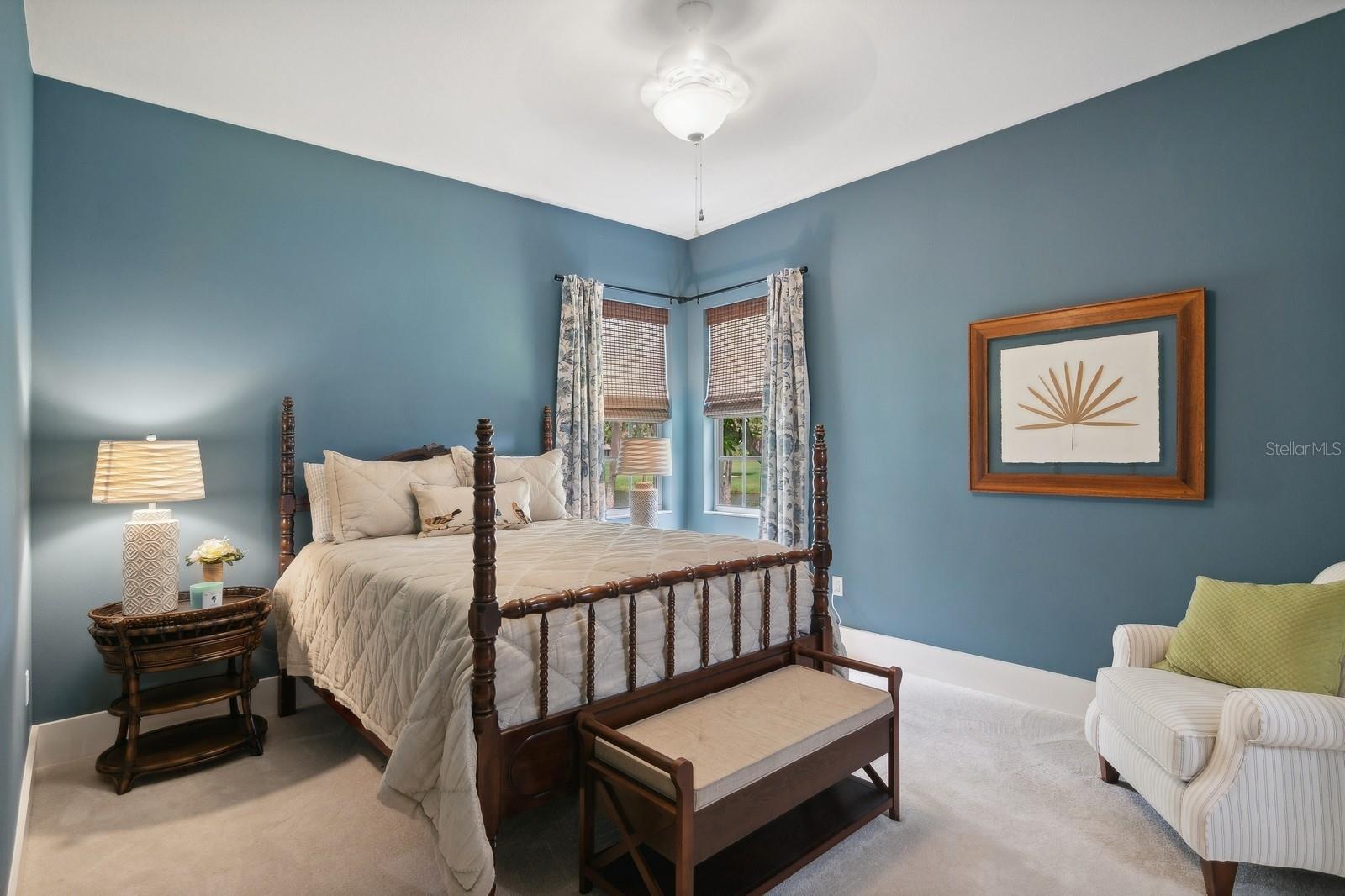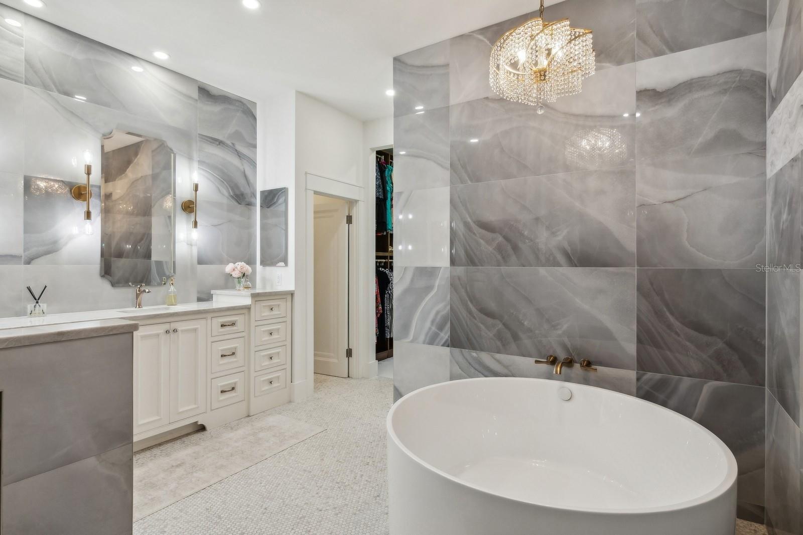 The owner's wing offers a luxurious bedroom suite with a spa-like bath featuring a soaking tub, zero-entry shower, dual sinks, custom cabinetry with accent lighting, a dressing room, and ensuite laundry--a true sanctuary for comfort and accessibility.