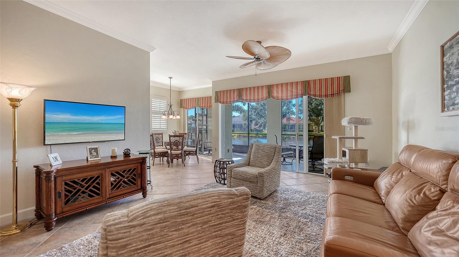 Exceptional water views from this rarely available ground floor condo with attached 2 car garage. 2 generous bedrooms plus an office which could be 3rd bedroom with 2 full baths. Beautiful tile floors throughout main living area. 2 year old AC & new tankless water heater. Kitchen features wood cabinets, granite counters & newer stainless appliances. Botanica is the ultimate in maintenance free living. The fee includes: all exterior maintenance, cable TV, water sewer, exterior insurance, beautiful community center, 2 heated pools, state of the art fitness center & updated clubhouse. This exclusive gated community is conveniently located in the heart of Palmer Ranch near shopping, Legacy bike trail & a short drive to world famous Siesta Key Beaches.