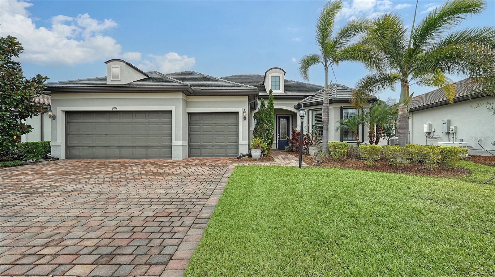 Come see this lovely home located in the gated 55+ Del Webb community in Lakewood Ranch. This popular Pinnacle model offers 3 bedrooms, 3 baths, a den, and gourmet kitchen with many built-ins. The zero corner slider leads to the screened lanai -- a great place where you can enjoy your morning coffee, relax, and entertain guests. The home offers 2488 square feet of living space along with a three-car garage (2 cars plus golf cart). The living areas have tiled floors and crown molding. Bedrooms have carpet. The spacious primary bedroom and ensuite bath has a spacious walk-in closet, large shower, and vanity with dual sinks. The open floor plan has a large gathering area adjacent to the spacious gourmet kitchen, and dinette. The kitchen countertops are quartz with white cabinetry and stainless steel appliances. There is a spacious walk-in pantry. A large island with sink, work space, breakfast bar separate the kitchen from the great room. At one end of the kitchen the dining area has easy access to the lanai. The laundry room has a utility sink and cabinetry along one wall. The home has plantation shutters throughout and hurricane shutters on the windows and doors. The 28,000 square foot Clubhouse is located within walking distance or a short drive. The Clubhouse offers numerous amenities, including, but not limited to a resort-style pool, state-of-the-art fitness center, pickleball and tennis courts, and game rooms. The Sailfish Bar and Grill restaurant offers indoor-outdoor waterfront dining. Del Webb at Lakewood Ranch is located within minutes of Lakewood Ranch Main Street and I-75 for easy access to Benderson Park, UTC shopping, restaurants, and entertainment. It is also just a short distance to Downtown Sarasota, St. Armands, and the beaches.