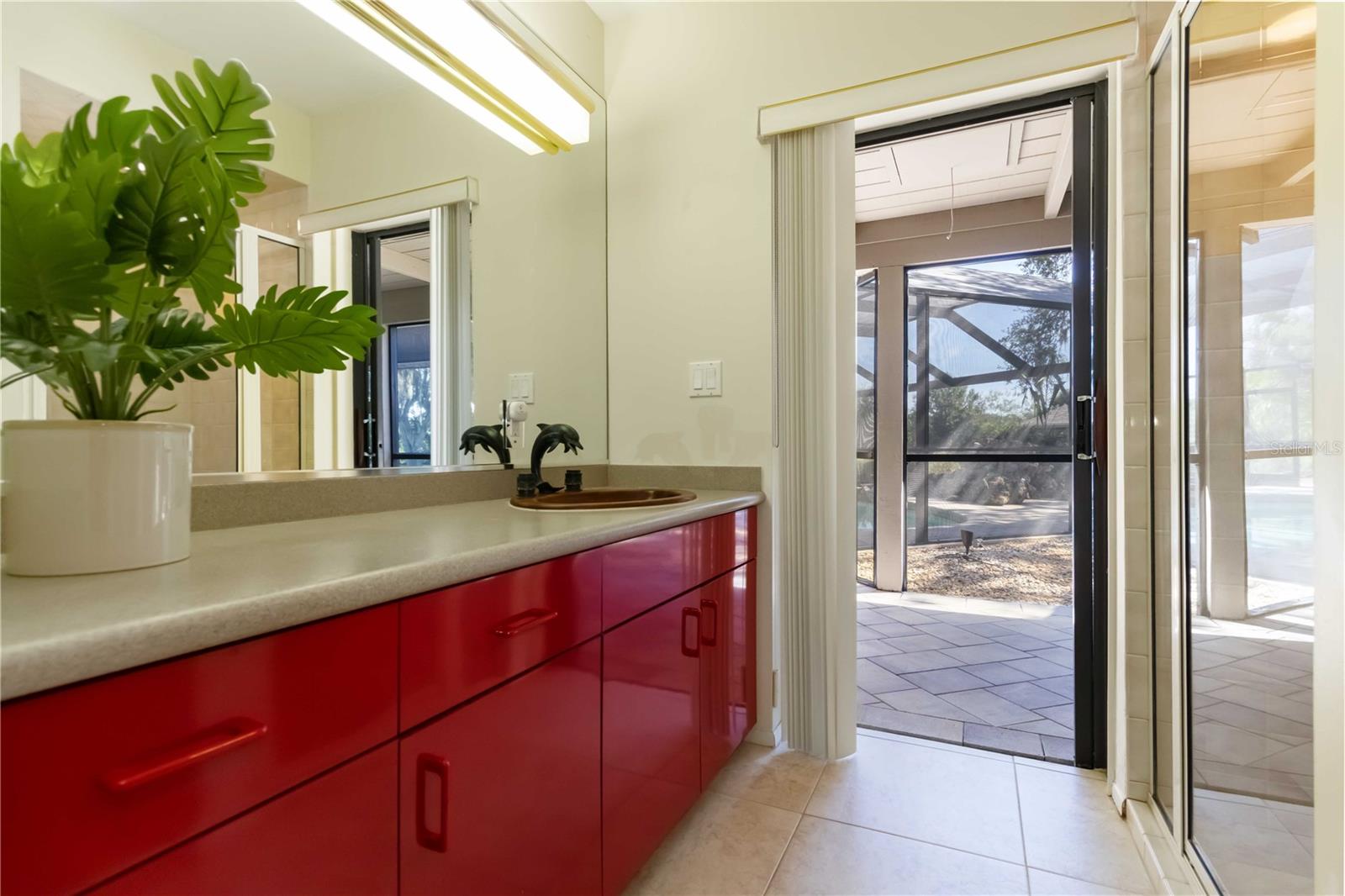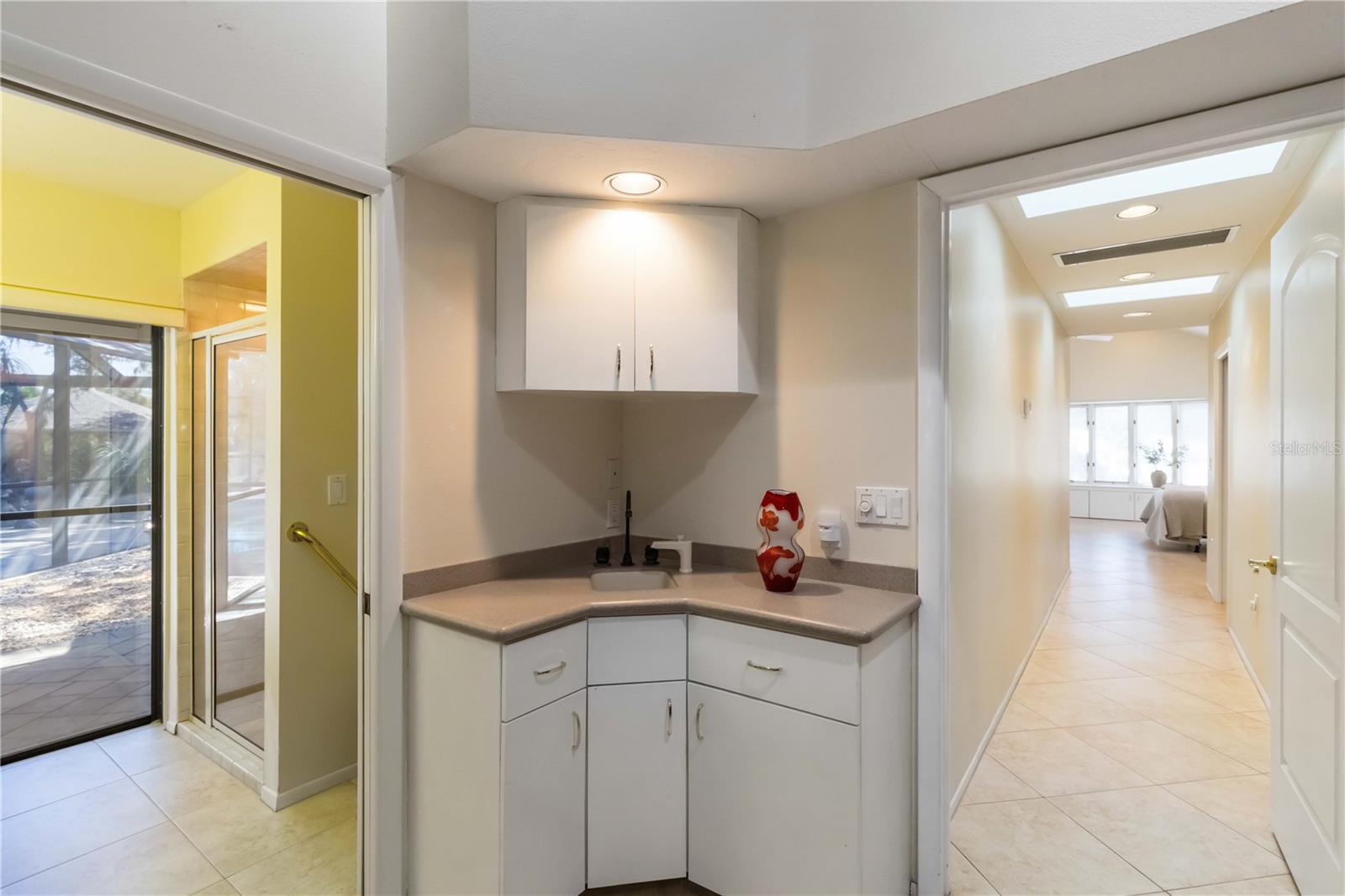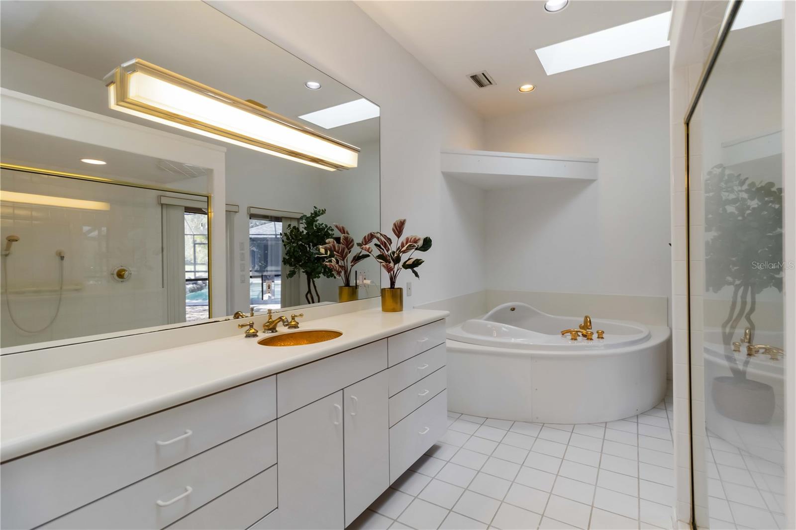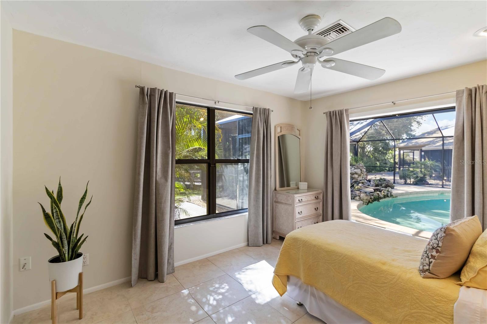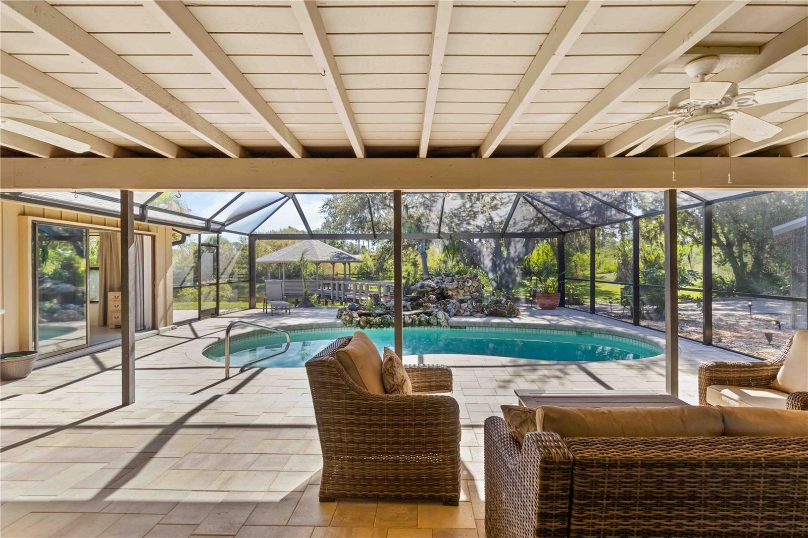 Improvements in 2025 include a new hot water heater, picture frame pool enclosure, and roof with transferable warranty. A thoughtfully designed addition expanded the original home adding a spacious primary suite featuring a vaulted ceiling, abundant natural light from multiple skylights, dual walk-in closets, a full ensuite bath, and direct access to an outdoor living space with wet bar and pool access. A beautiful library with custom wooden shelves and vaulted ceilings with a full pool bath too.