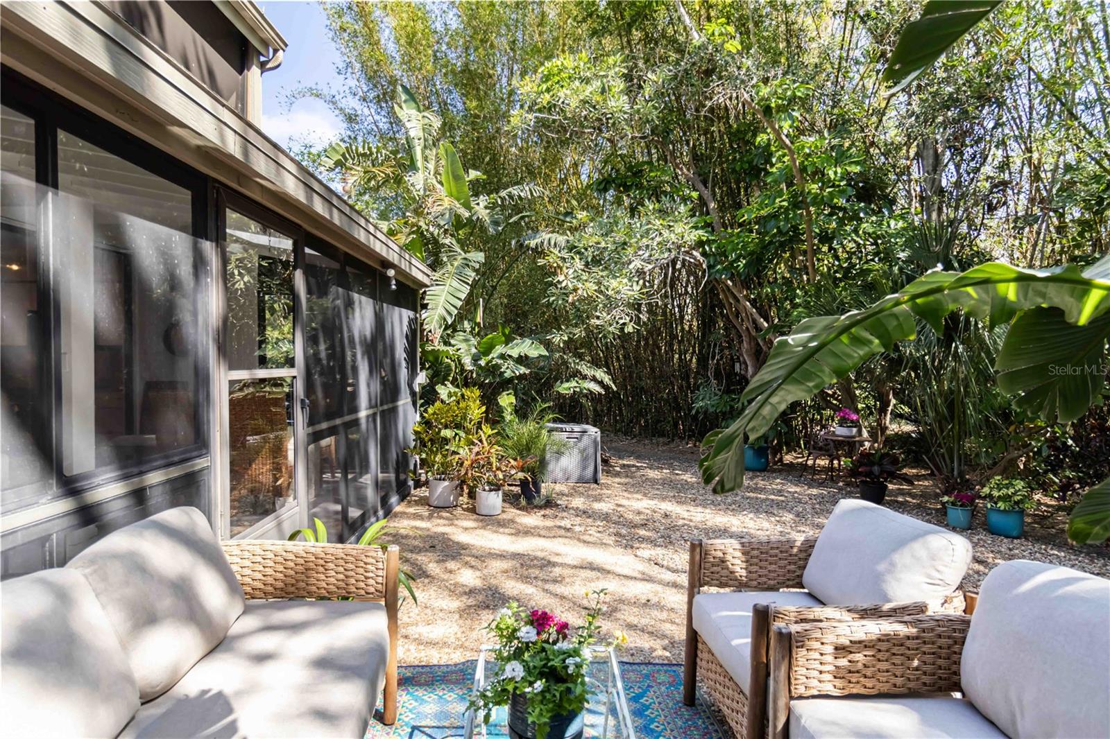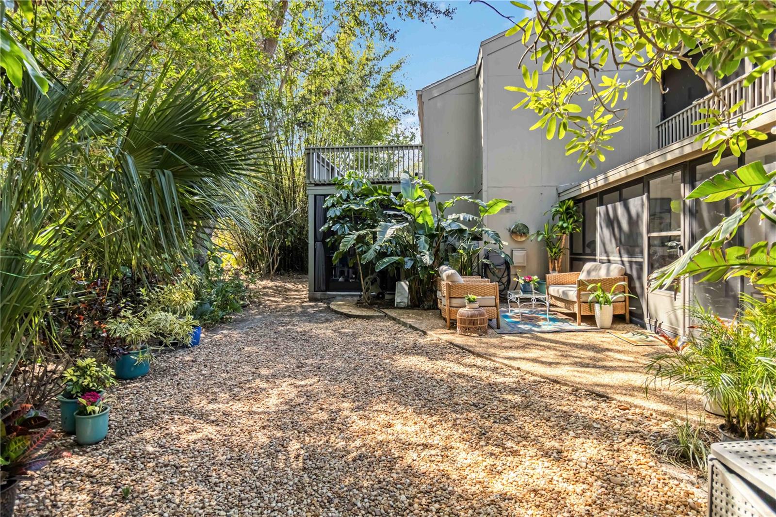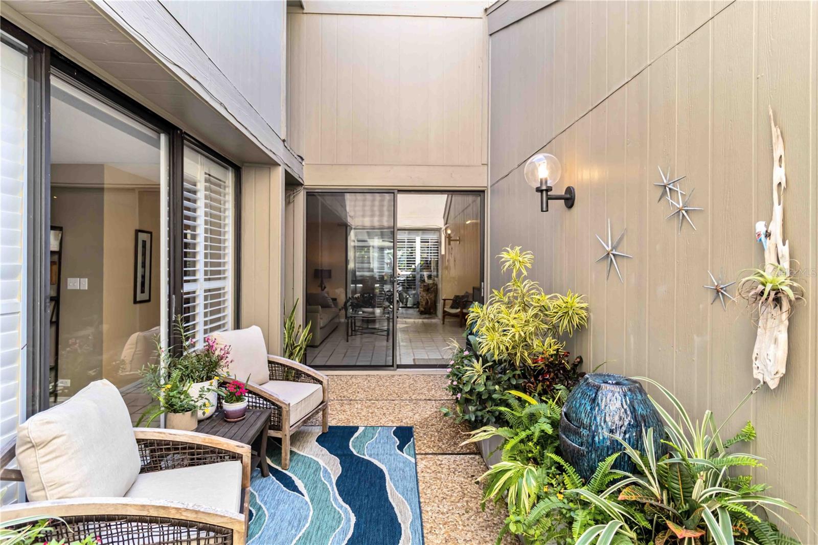 As you walk through the gate, you're greeted by a private courtyard that offers a quiet space to enjoy the outdoors. Inside, the condo features an open living area, a Florida room for extra relaxation space, and an outdoor patio surrounded by mature vegetation, offering added privacy and greenery in the backyard. A covered carport is included for convenience.