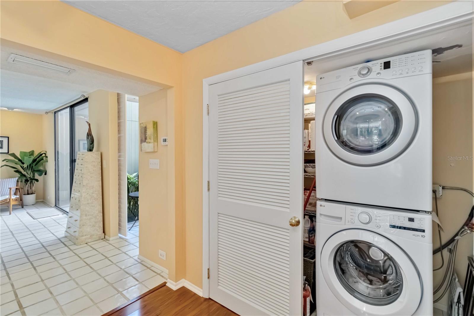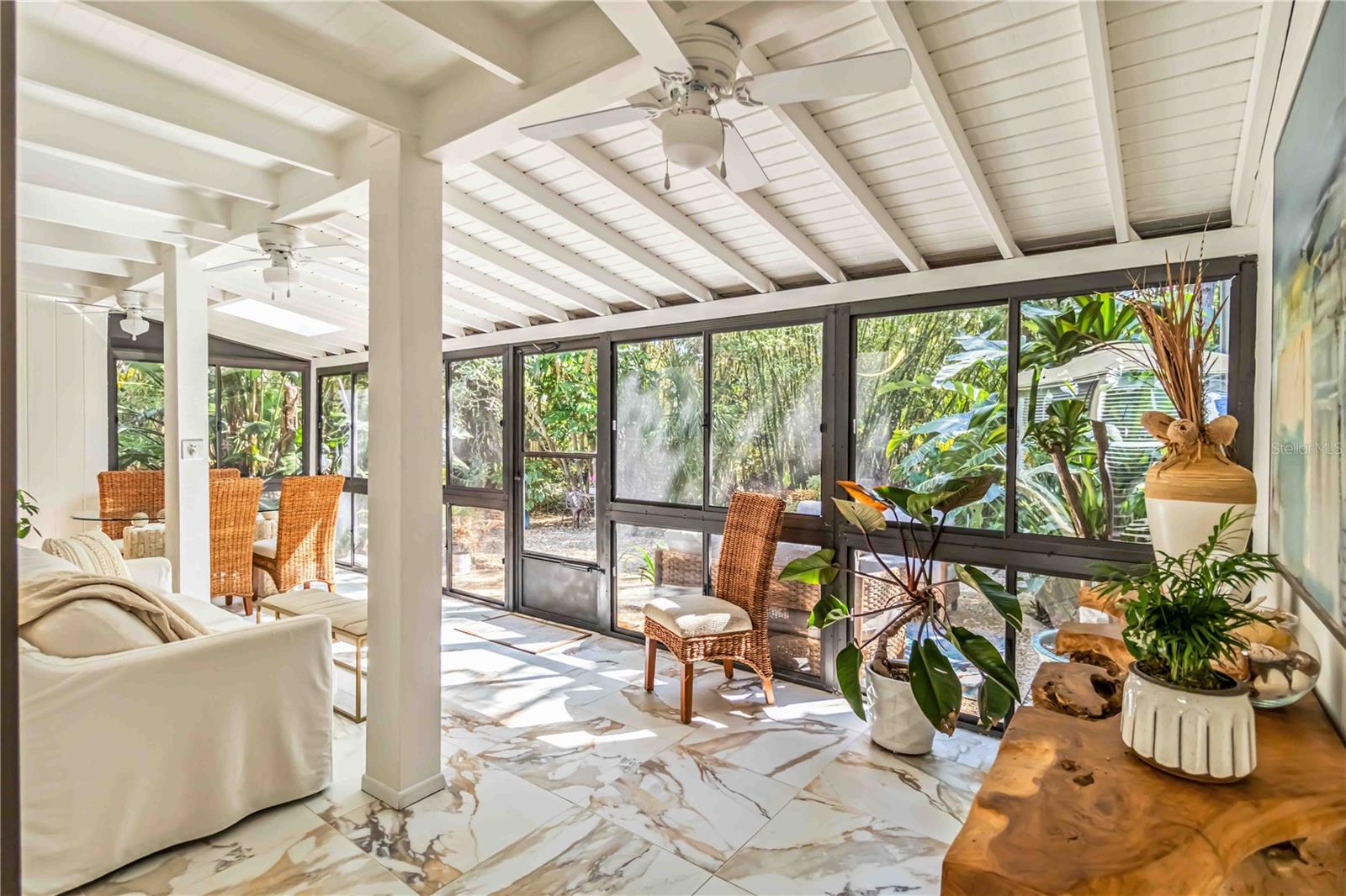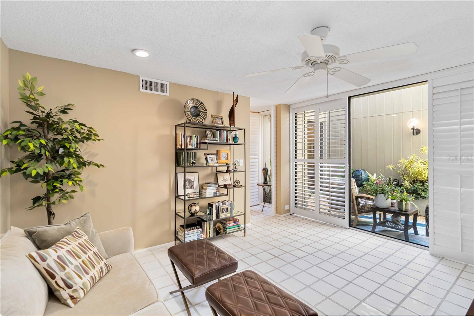 As you walk through the gate, you're greeted by a private courtyard that offers a quiet space to enjoy the outdoors. Inside, the condo features an open living area, a Florida room for extra relaxation space, and an outdoor patio surrounded by mature vegetation, offering added privacy and greenery in the backyard. A covered carport is included for convenience.