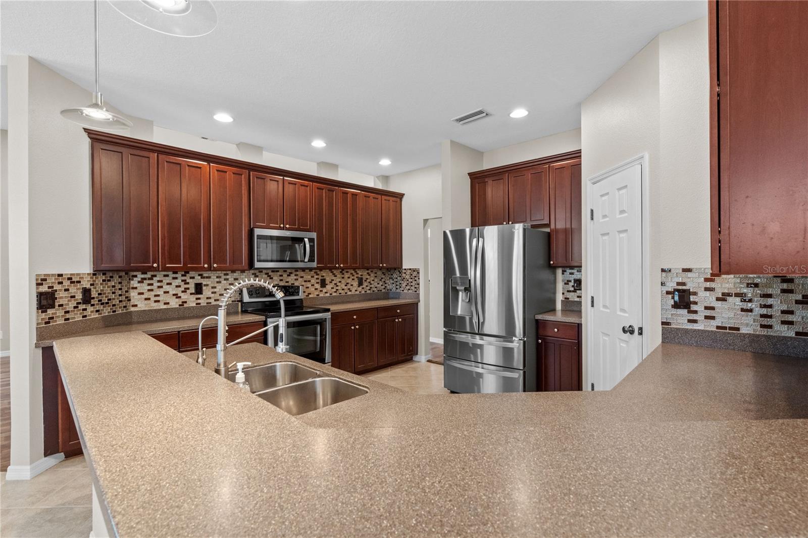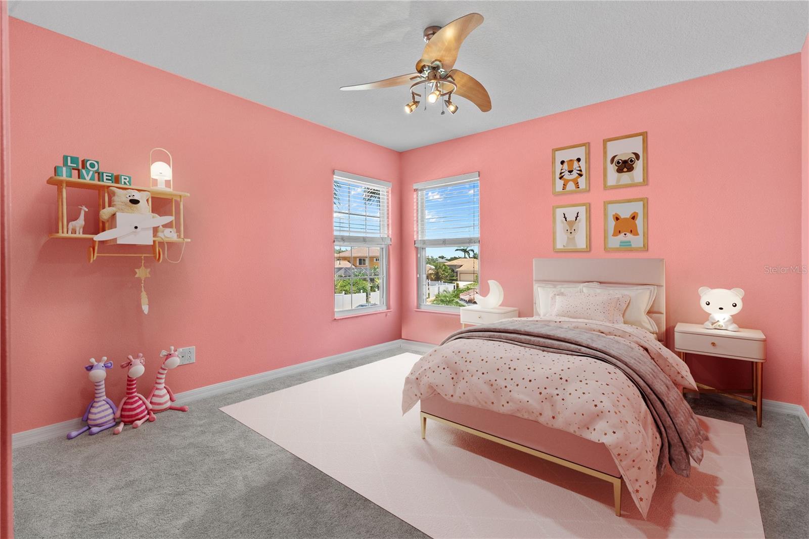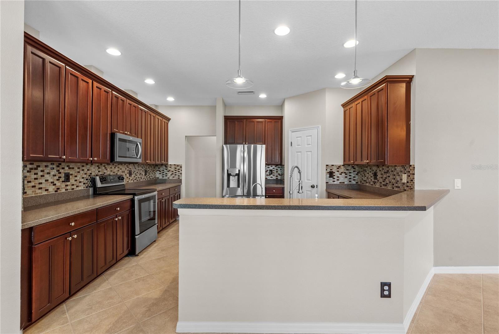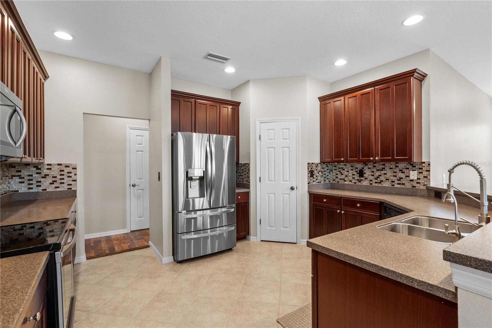 Upstairs, you'll find three more generously sized bedrooms, each with new carpet, creating a cozy and comfortable space for guests. Outside, the private backyard oasis features a large pool area surrounded by lush landscaping, perfect for relaxing or hosting guests. The 1/4-acre lot provides plenty of room to enjoy the outdoors, while mature trees offer beauty and privacy.