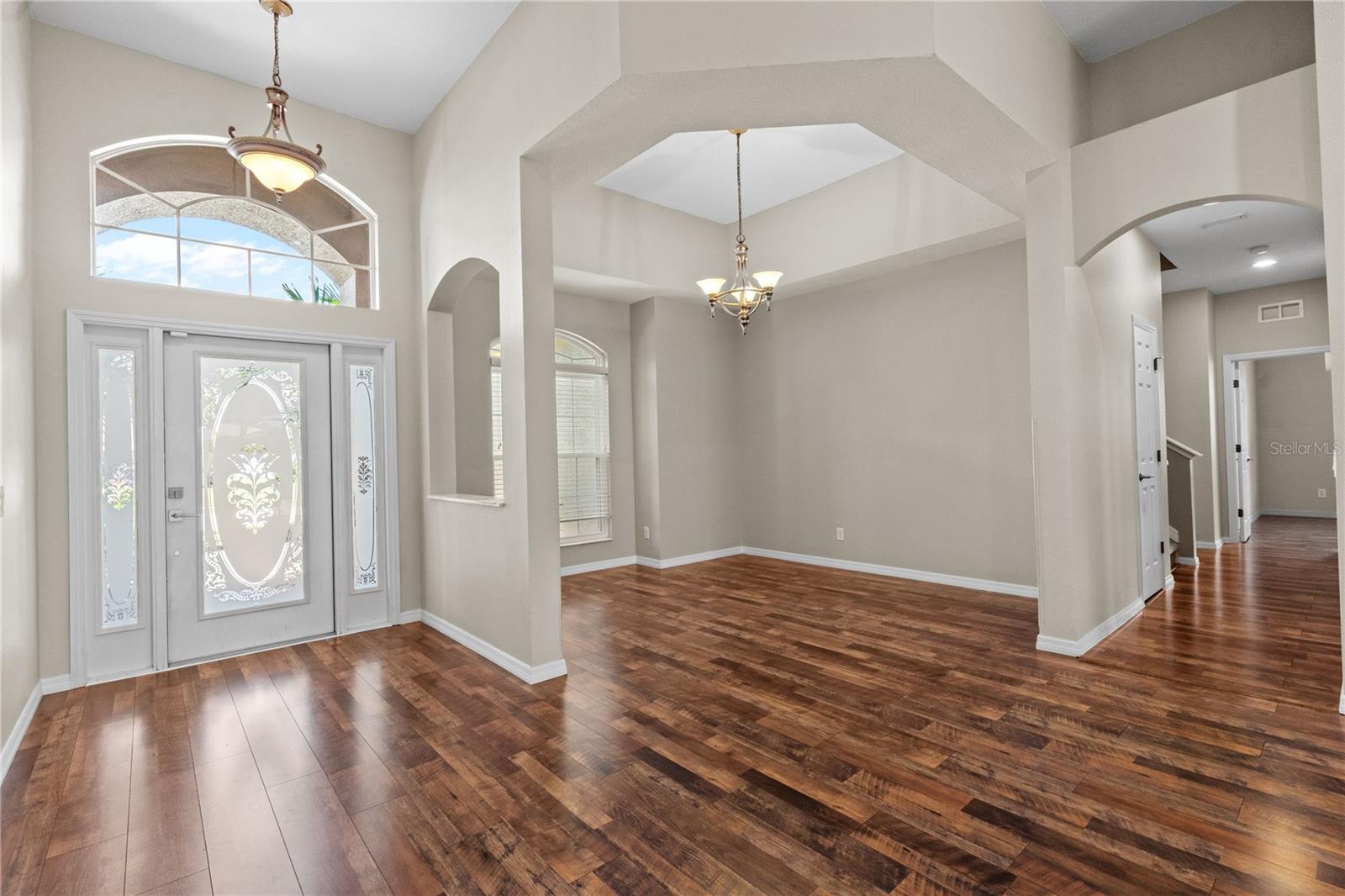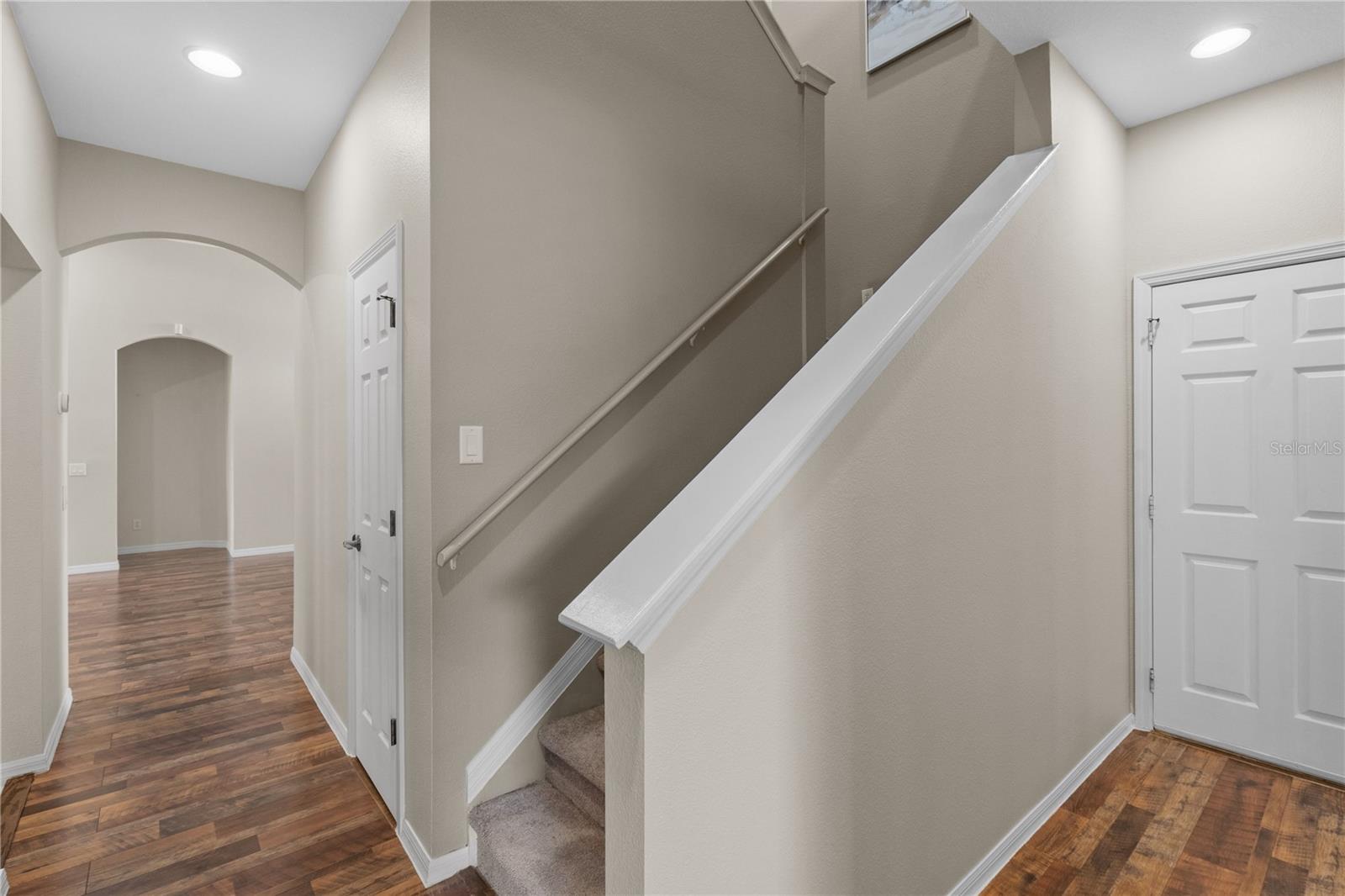As you enter, you're welcomed by a bright and open living area with freshly painted walls and newly installed carpet on the stairs and upstairs, creating a warm, inviting atmosphere. The modern door hardware adds a sleek touch to the home's updated aesthetic. The layout flows seamlessly into the dining and kitchen area, making it ideal for intimate dinners or entertaining large groups.