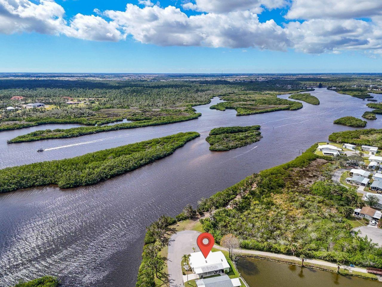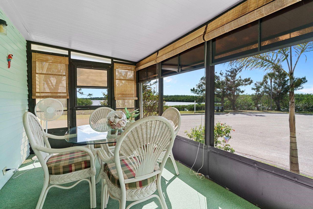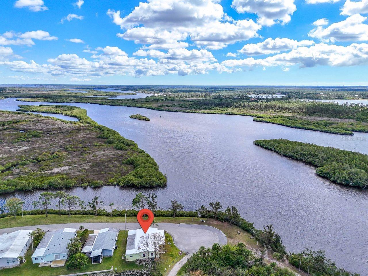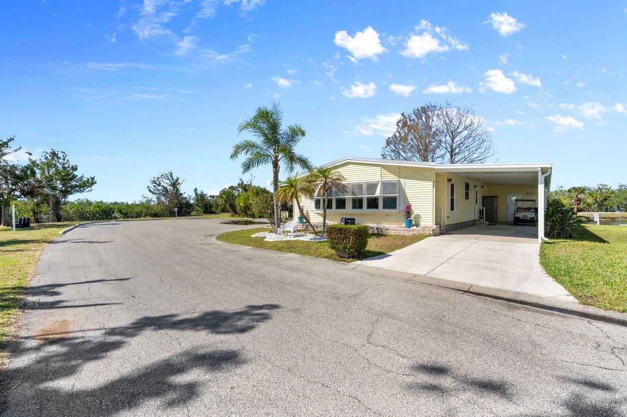 This is the LOCATION YOU HAVE BEEN WAITING FOR! Breathtaking water views of the Myakka River from this 2 bedroom, 2 bathroom home that backs to a lake, providing water views from every window in the house! Located in the 55+ community of Harbor Cove, this rare find is approximately 1,396 SF with an additional 272 SF west-facing lanai. Watch wading birds glide across the water every evening on their way to nesting grounds -- a spectacle that adds magic to your everyday life. View glorious sunsets, and as the last house on the street, nothing will block your view. Launch a kayak or rent a boat slip at the marina for only $100 per year and explore scenic waterways all the way to the Gulf! Inside, find a large open layout with cathedral ceilings and lovely natural light thanks to some new PGT windows in the living room plus multiple new skylights. The roomy kitchen has plenty of counter space and cabinetry, plus a pantry. A sizeable primary suite contains a walk-in closet and French doors leading to the ensuite bathroom with large jacuzzi tub and walk-in shower. The guest room has sliding doors directly to the lanai and the hall bath is nearby. The small bonus room has a storage closet and handy desk area. Lots of parking space on the long driveway with carport and a shed with washer and dryer. The quality furnishings and golf cart are included in the sale and a new roof was just installed. The HOA fees are only $150 per month and include a Share, voting rights and access to incredible amenities including 2 swimming pools, spa, huge 2 story clubhouse overlooking the 90-slip marina, fitness center and various sports leagues and courts. Socialize and make friends at dances, shows, picnics, outings, craft classes, woodworking, etc. Located near shopping, dining, hospitals, parks, golf, spring training baseball stadiums and more. This property is surrounded by nature and is truly enchanting. Come and experience it for yourself!