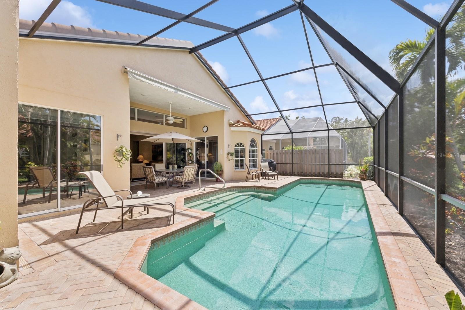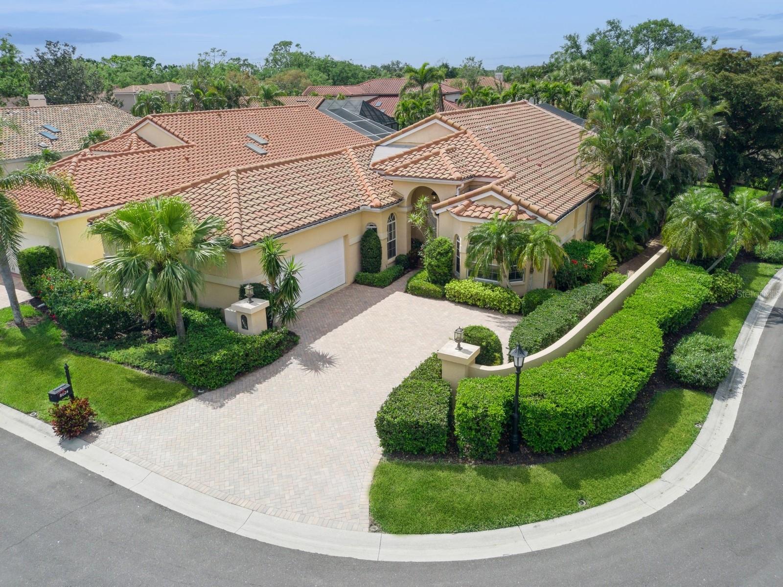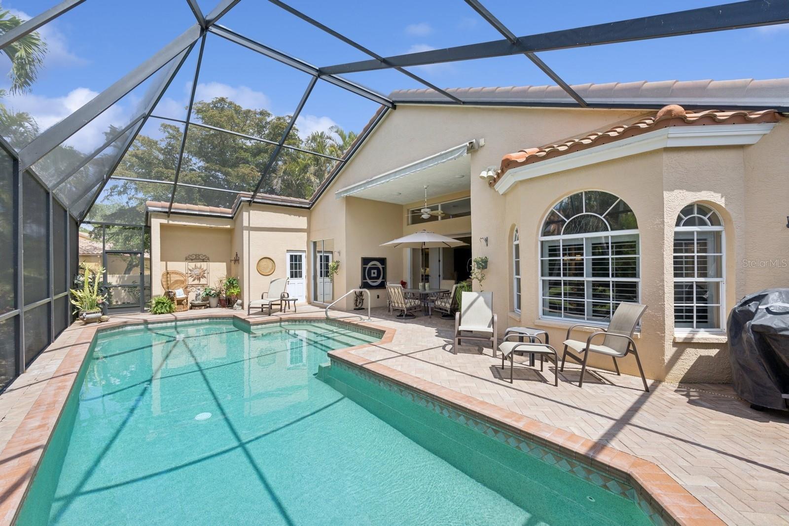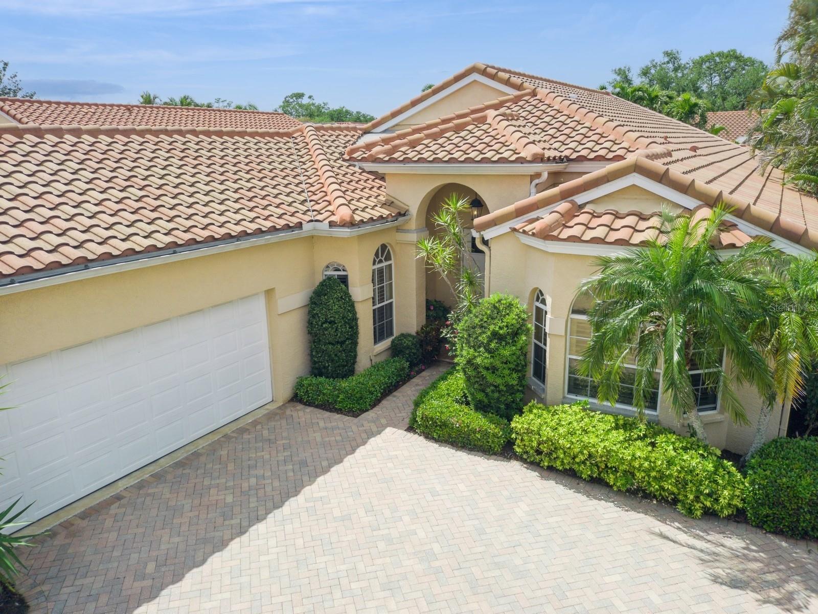 Welcome to Villa Fiore! This residence nestled in the upscale golf club community of TPC Prestancia offers a vibrant lifestyle in a peaceful and intimate environment. Discover the perfect blend of classic charm and modern comfort in this custom built one-story single home presenting over 2700 square feet of living space. Designed with elegant architectural details and soaring ceilings, this home offers a warm and inviting ambiance with a layout that flows effortlessly for both everyday living and entertaining. The kitchen with granite countertops and stainless appliances (new dishwasher and microwave) opens towards the family room. With the spacious living room featuring a wet bar and the dining room, you can easily entertain family and guests. The spacious owner's suite opens toward the lanai and offers ample walk-in closets and plantation shutters. Each of the two guest bedrooms is ensuite, with renovated bathrooms and new flooring and provides ultimate comfort and privacy. The description would not be complete without talking about the expansive lanai showcasing the sparkling heated pool, creating a perfect outdoor retreat in this backyard surrounded by walls on two sides. With a pool bathroom, lawn behind the lanai, and shade at your convenience with the automated awning, you will be pleasantly surprised by this outdoor living space! Laundry and a two-car garage complete this property. The home is extremely well maintained with a tile roof of 2013, an air conditioning unit of 2018 and a newer pool heater. The property was entirely repiped in 2005. With this Mediterranean-inspired home you get the chance to live in a "free maintenance" small community. Bring your imagination to personalize this home to your taste. Offered turnkey, this home is centrally located near Siesta Beach, downtown Sarasota, fine dining and Arts scenes, Sarasota Airport, Sarasota Memorial Hospital. Legacy Trail, Fitness, tennis club and pickleball facilities are minutes away. Bike, jog, walk in this Audubon sanctuary or enjoy two 18-hole golf courses at TPC Golf Club (several memberships are available and optional) and make new friends in this vibrant community. Make your appointment for a private showing! 3D Tour and floorplan available.