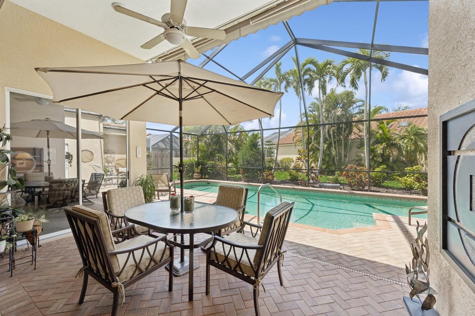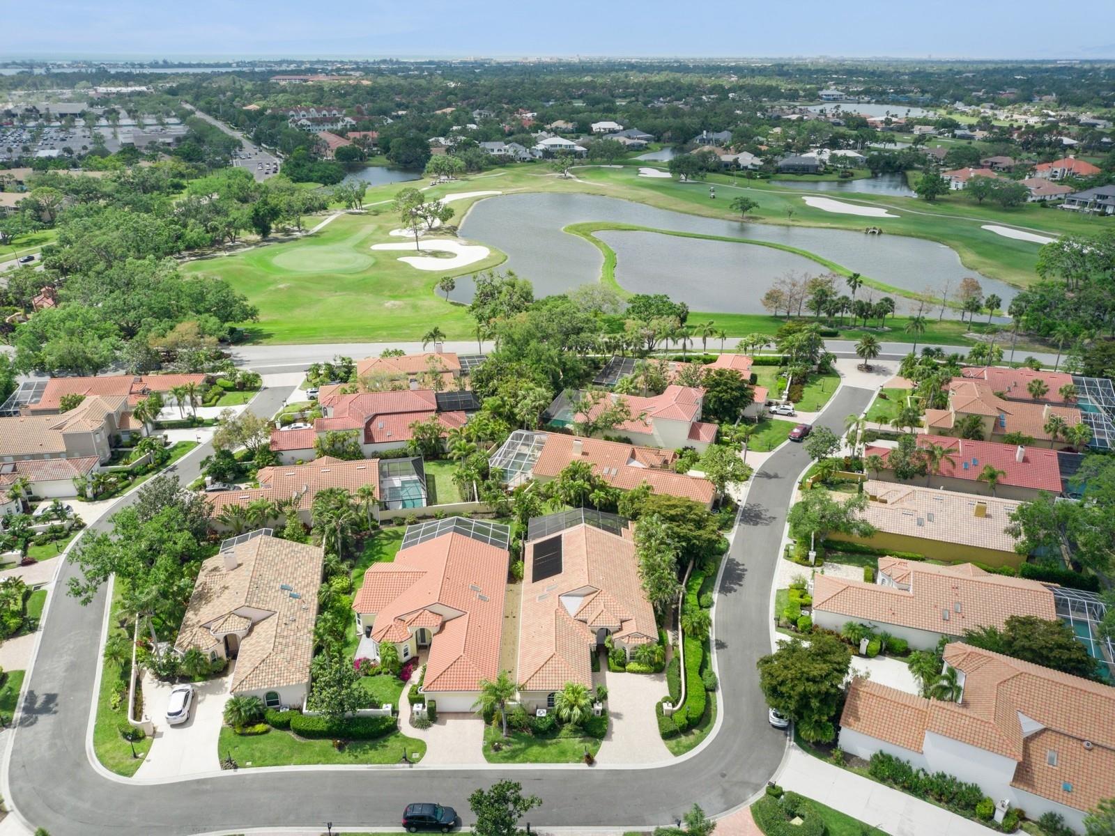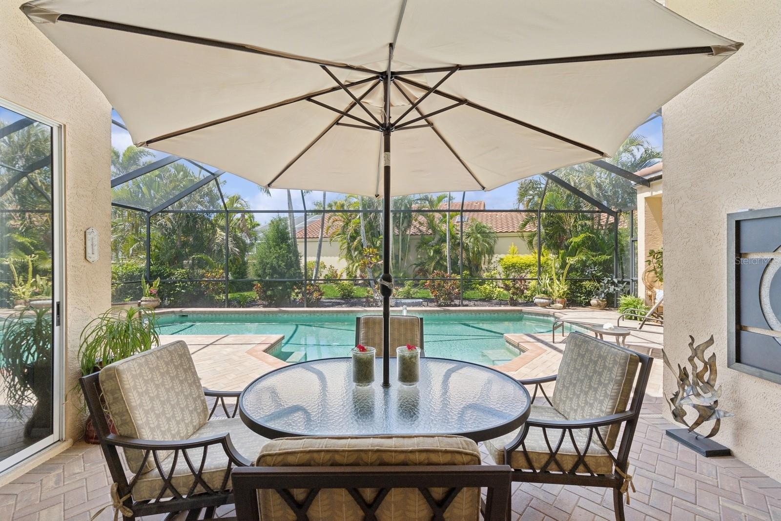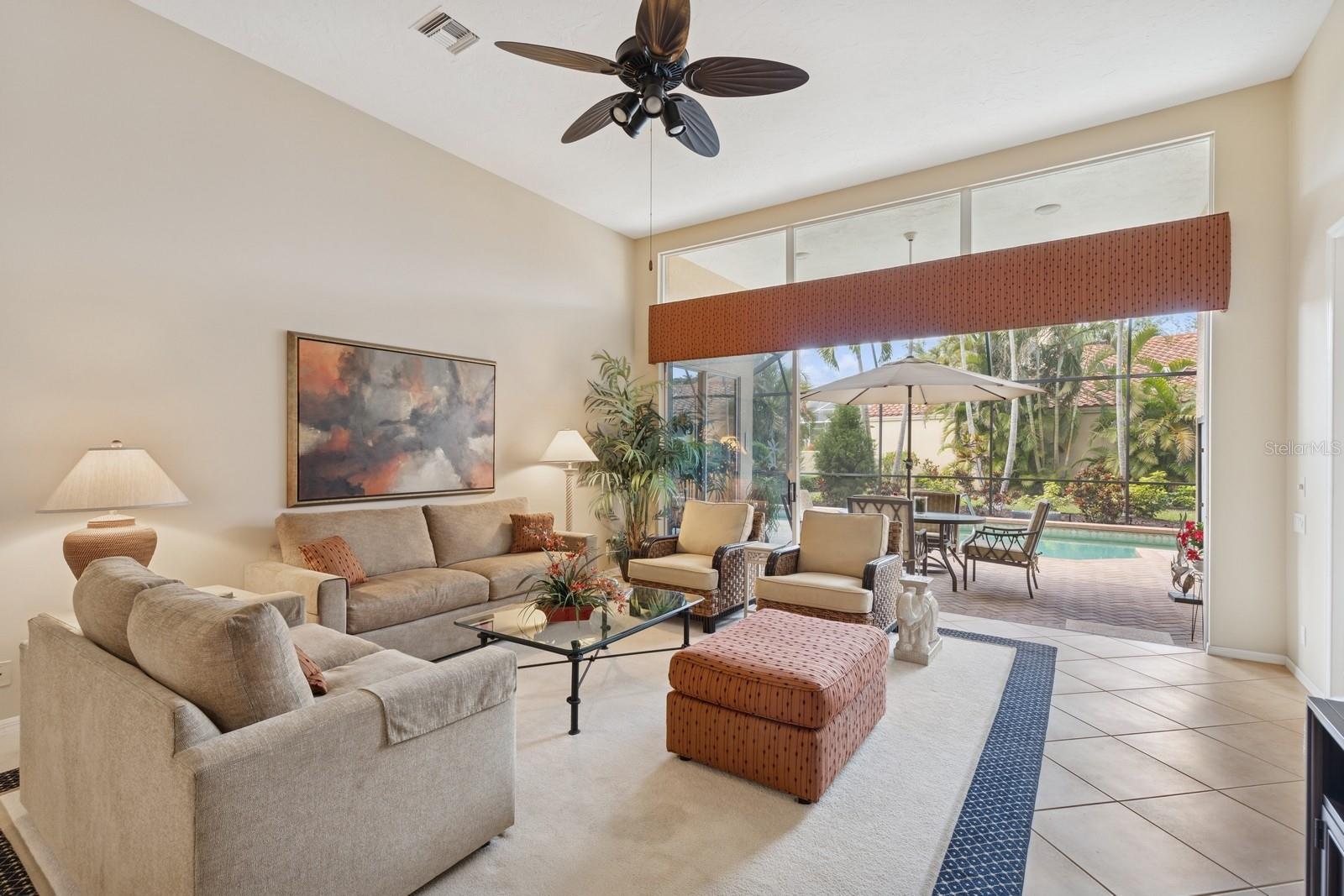 Welcome to Villa Fiore! This residence nestled in the upscale golf club community of TPC Prestancia offers a vibrant lifestyle in a peaceful and intimate environment. Discover the perfect blend of classic charm and modern comfort in this custom built one-story single home presenting over 2700 square feet of living space. Designed with elegant architectural details and soaring ceilings, this home offers a warm and inviting ambiance with a layout that flows effortlessly for both everyday living and entertaining. The kitchen with granite countertops and stainless appliances (new dishwasher and microwave) opens towards the family room. With the spacious living room featuring a wet bar and the dining room, you can easily entertain family and guests. The spacious owner's suite opens toward the lanai and offers ample walk-in closets and plantation shutters. Each of the two guest bedrooms is ensuite, with renovated bathrooms and new flooring and provides ultimate comfort and privacy. The description would not be complete without talking about the expansive lanai showcasing the sparkling heated pool, creating a perfect outdoor retreat in this backyard surrounded by walls on two sides. With a pool bathroom, lawn behind the lanai, and shade at your convenience with the automated awning, you will be pleasantly surprised by this outdoor living space! Laundry and a two-car garage complete this property. The home is extremely well maintained with a tile roof of 2013, an air conditioning unit of 2018 and a newer pool heater. The property was entirely repiped in 2005. With this Mediterranean-inspired home you get the chance to live in a "free maintenance" small community. Bring your imagination to personalize this home to your taste. Offered turnkey, this home is centrally located near Siesta Beach, downtown Sarasota, fine dining and Arts scenes, Sarasota Airport, Sarasota Memorial Hospital. Legacy Trail, Fitness, tennis club and pickleball facilities are minutes away. Bike, jog, walk in this Audubon sanctuary or enjoy two 18-hole golf courses at TPC Golf Club (several memberships are available and optional) and make new friends in this vibrant community. Make your appointment for a private showing! 3D Tour and floorplan available.